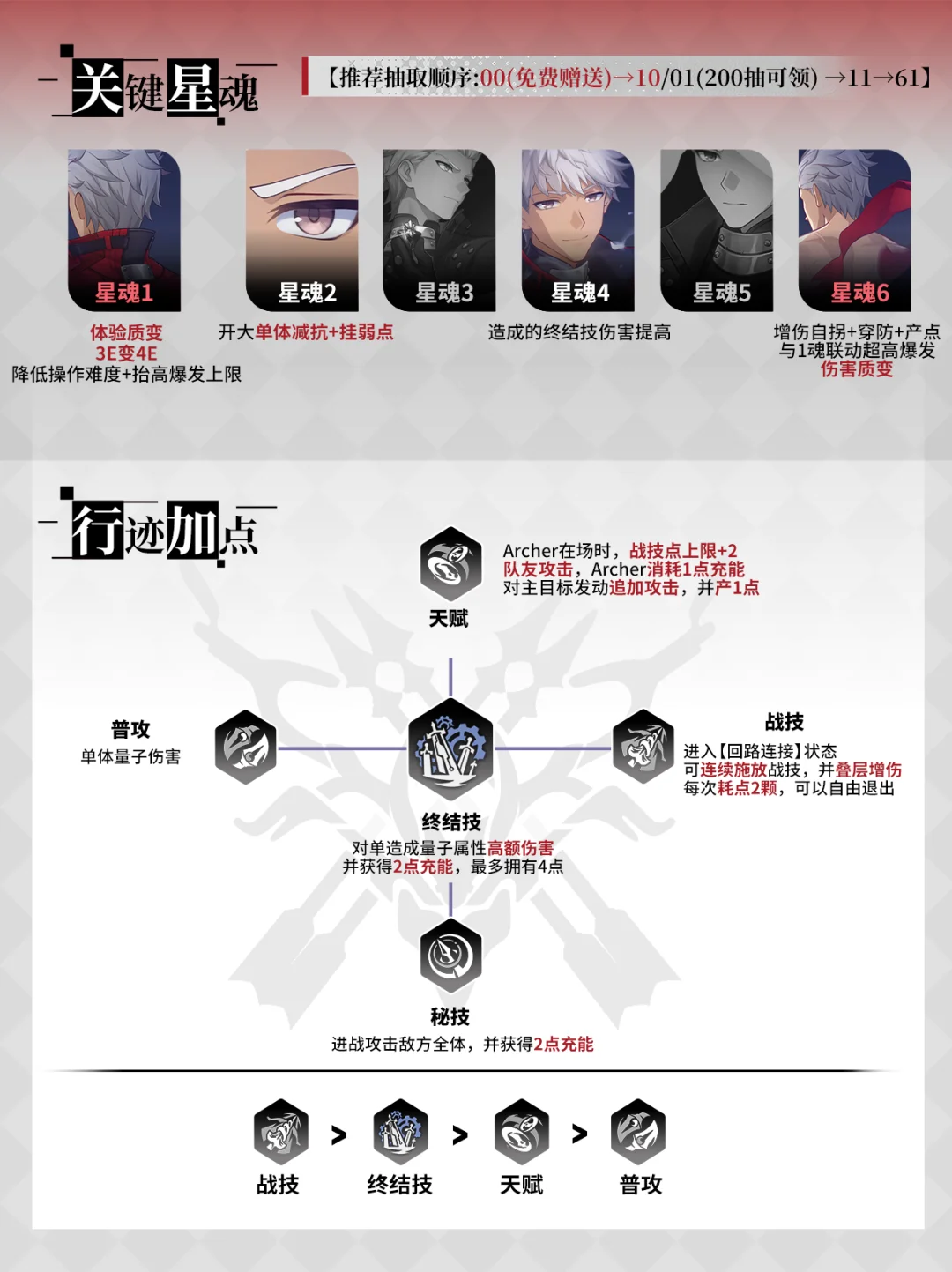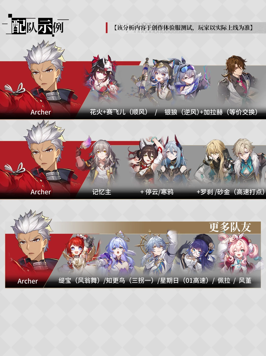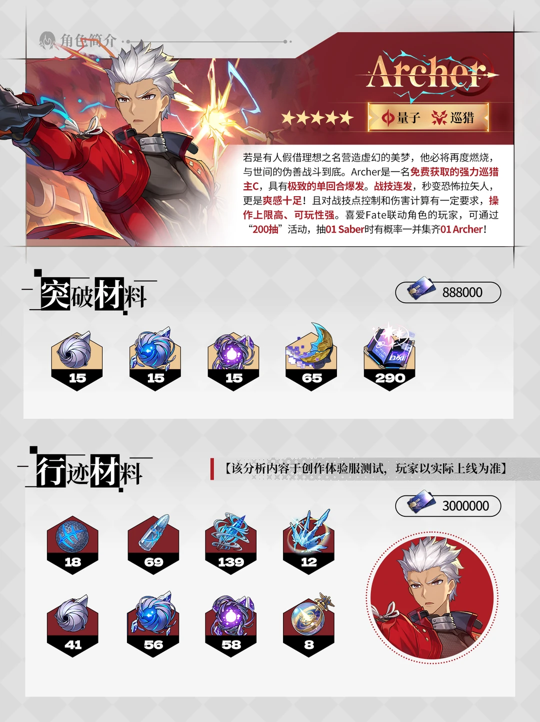 鼹鼠君来喽~ ≖‿≖✧ ▌Archer材料 | 行迹 | 光锥 | 遗器 | 配队|细节 ▌角色简介: Archer是一名免费获取的强力巡猎主C,极致的对单爆发+战技连发爽感,操作上限高可玩性强,秒变恐怖拉矢男!喜爱Fate联动角色的玩家,可通过“200抽”活动,抽01 Saber时有概率一并集齐01 Archer! *该内容来自创作体验服,以实际上线为准 -------- 「身为剑所天成,血若钢铁心似琉璃。」 “你准备抽几加几Archer?” [投票]