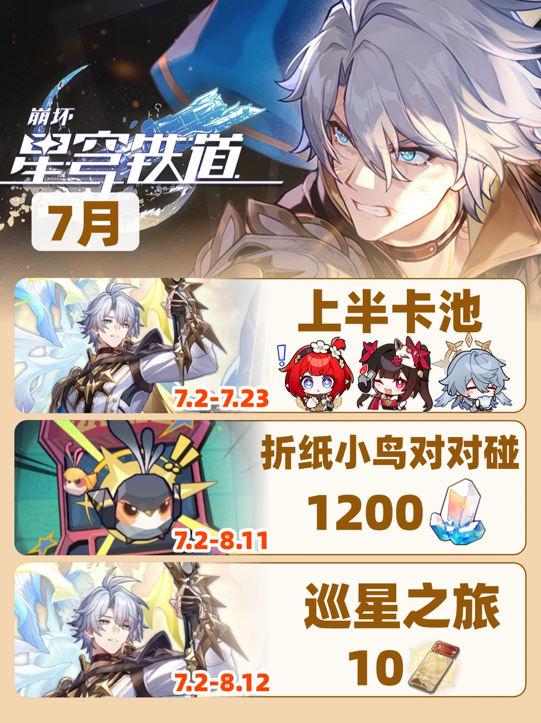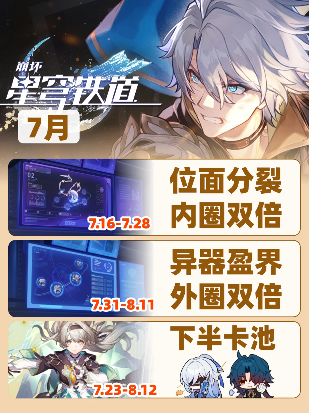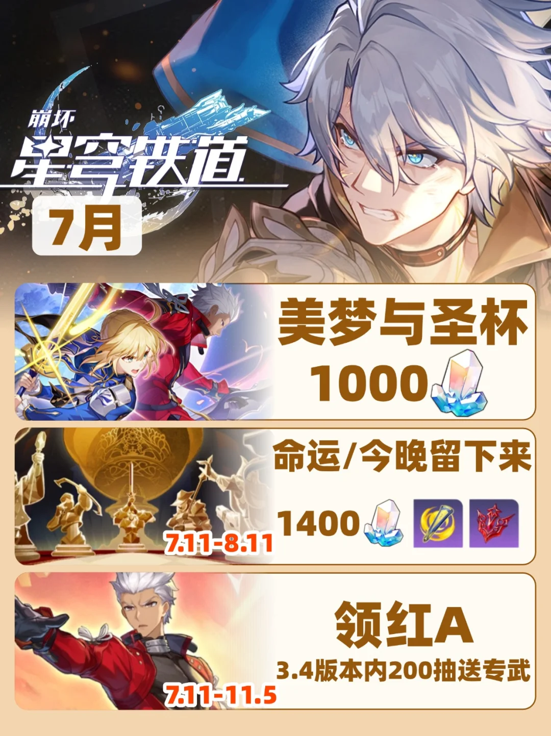 周一愉快! 鼹鼠君给大家送日历来啦~ ———— 🌈7月重点活动 ①2号(周三):白厄🆙周日缇宝花火,版本大活动 ②11号:Fate联动开启!Saber+Archer,红A登录即领 ③23号:下半,流萤+镜流+刃,Apple授权店线下活动 ———— [向右R]提前做好规划,点击保存随时可查!