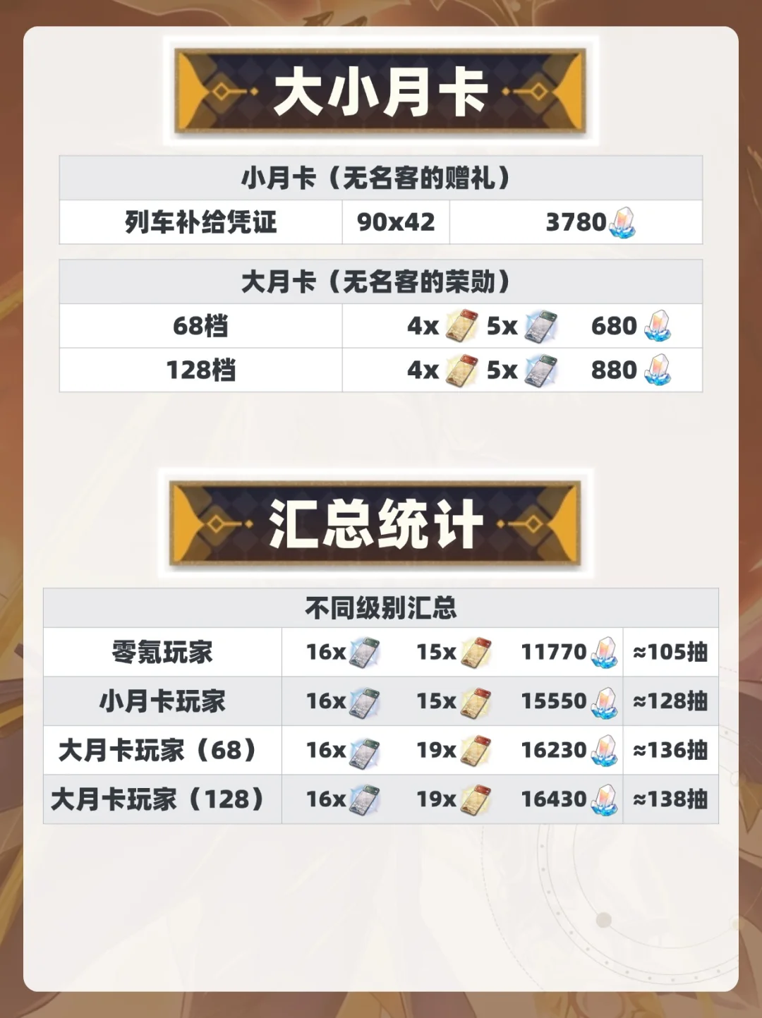 鼹鼠君来喽~ ≖‿≖✧ [星R]省流:(内容皆为估算,仅供参考哦) ①零氪约89抽 ②小月卡112抽 ③大月卡120-122抽 其中上半卡池(白厄)零氪约60抽,小月卡约70抽 新版本为7.2-7.23-8.12,共42天,祝大家好运连连喔~
