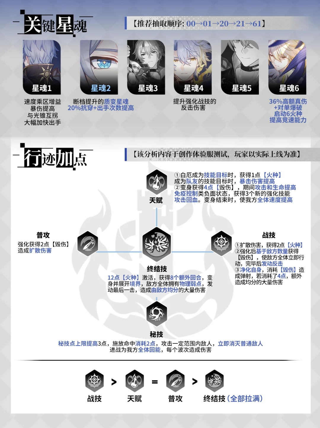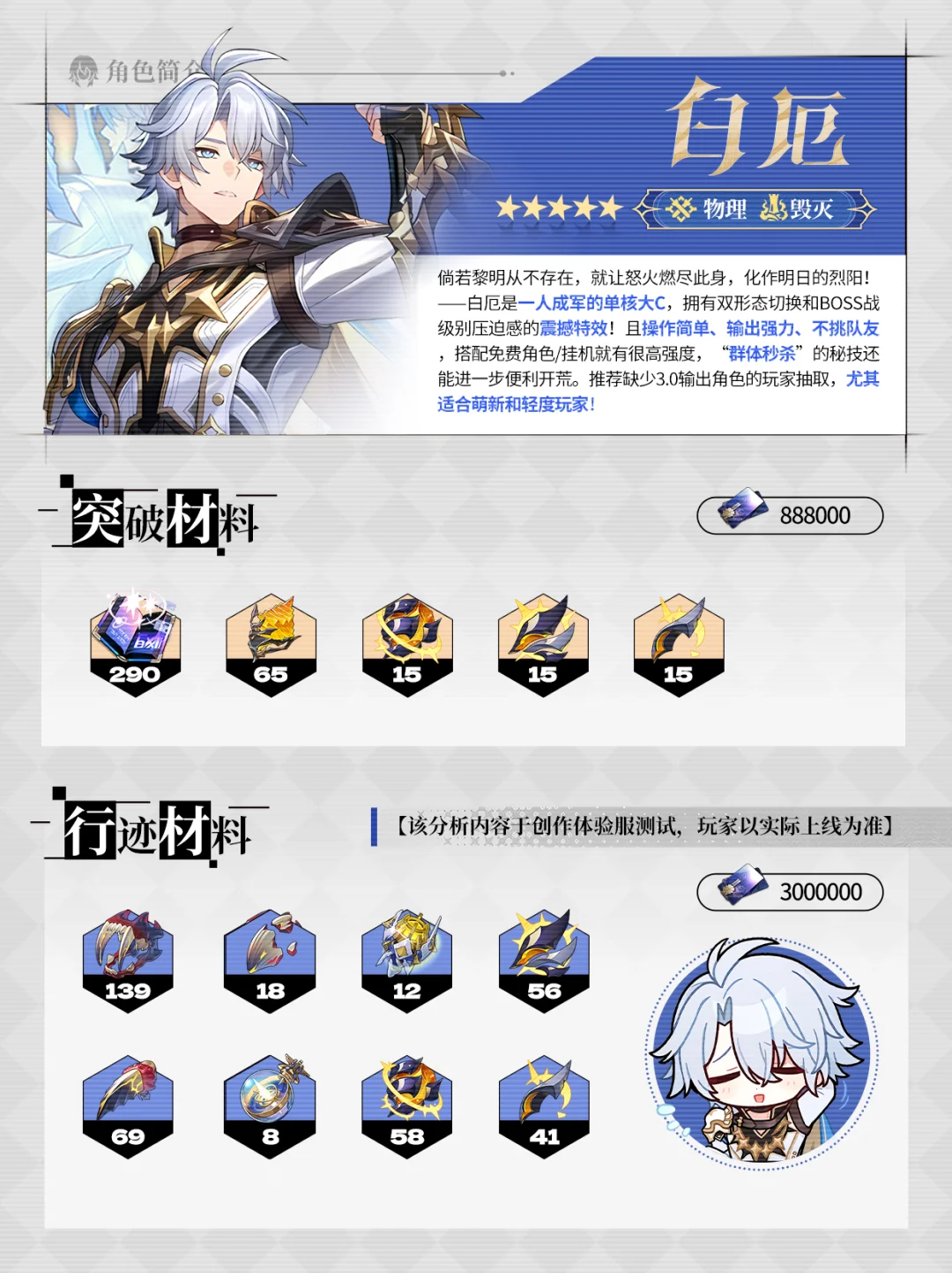 鼹鼠君来喽~ ≖‿≖✧ ▌白厄材料 | 行迹 | 光锥 | 遗器 | 配队|细节 ▌角色简介: 白厄是一人成军的单核大C,拥有双形态切换和BOSS战级别压迫感的震撼特效!且操作简单、输出强力、不挑队友,推荐缺少3.0输出角色的玩家抽取,尤其适合萌新和轻度玩家! *该内容来自创作体验服,以实际上线为准 -------- 「我们终将成为,点燃新世界的烈焰。」 “你准备抽几加几白厄?” [投票]