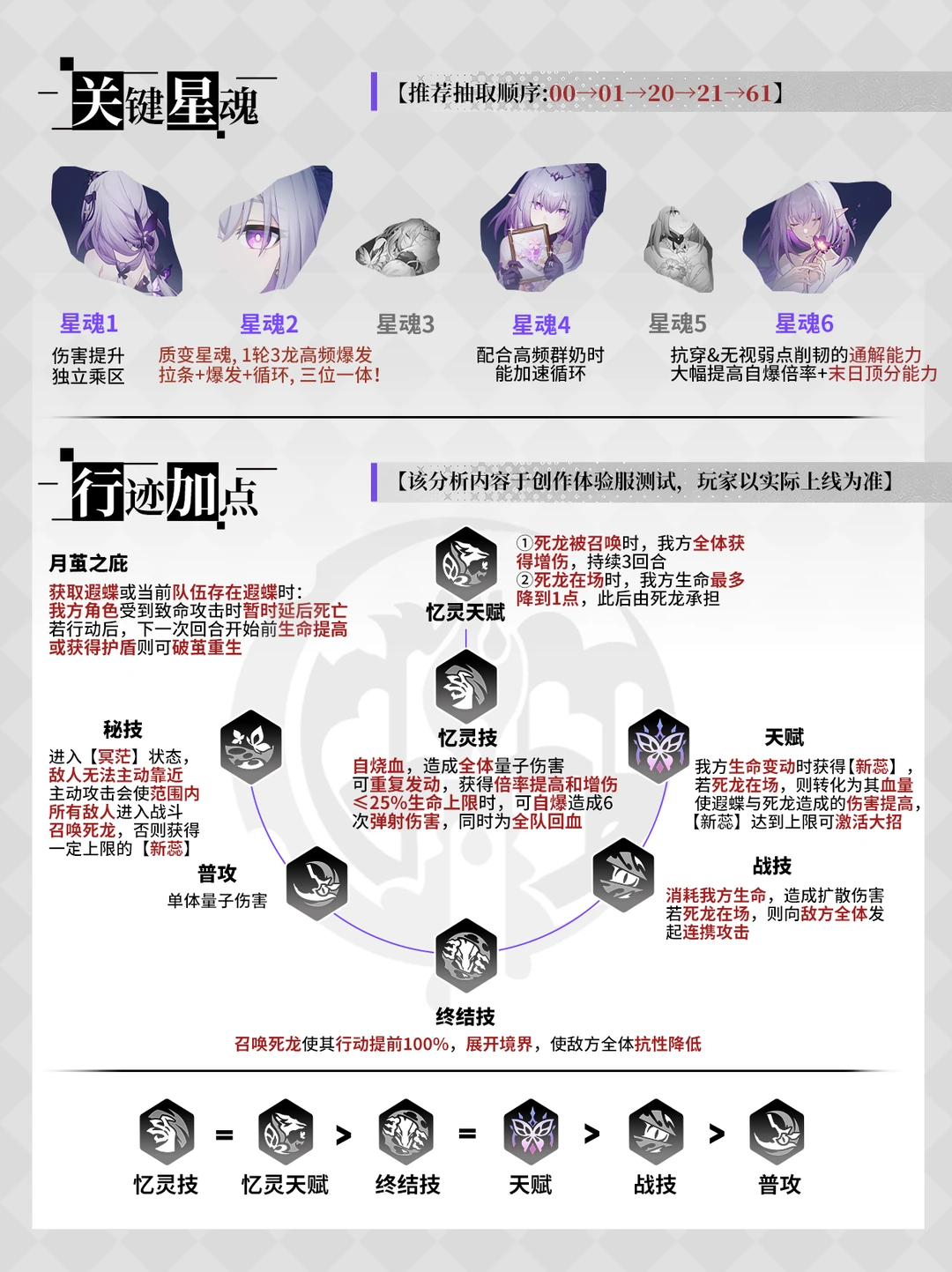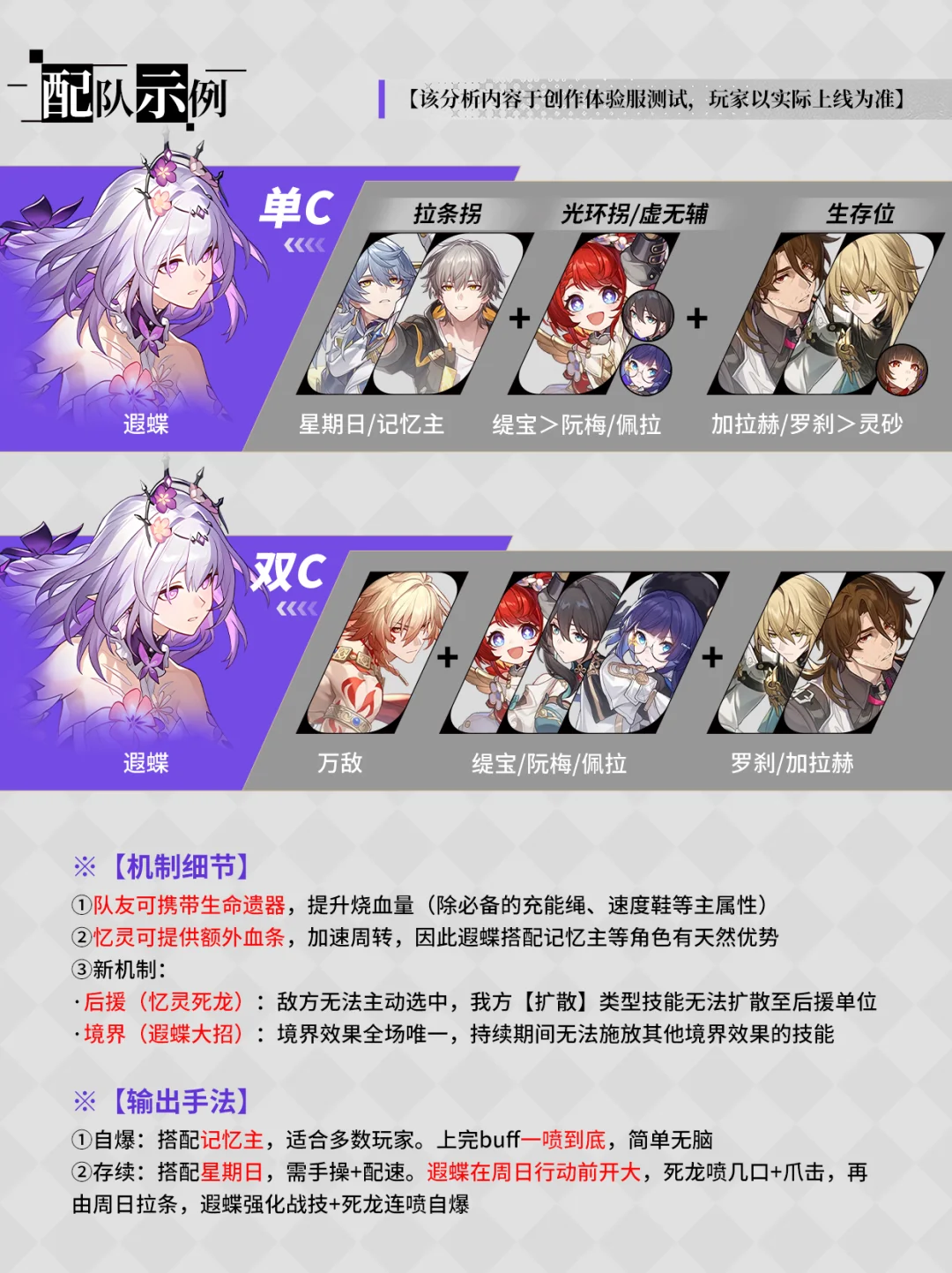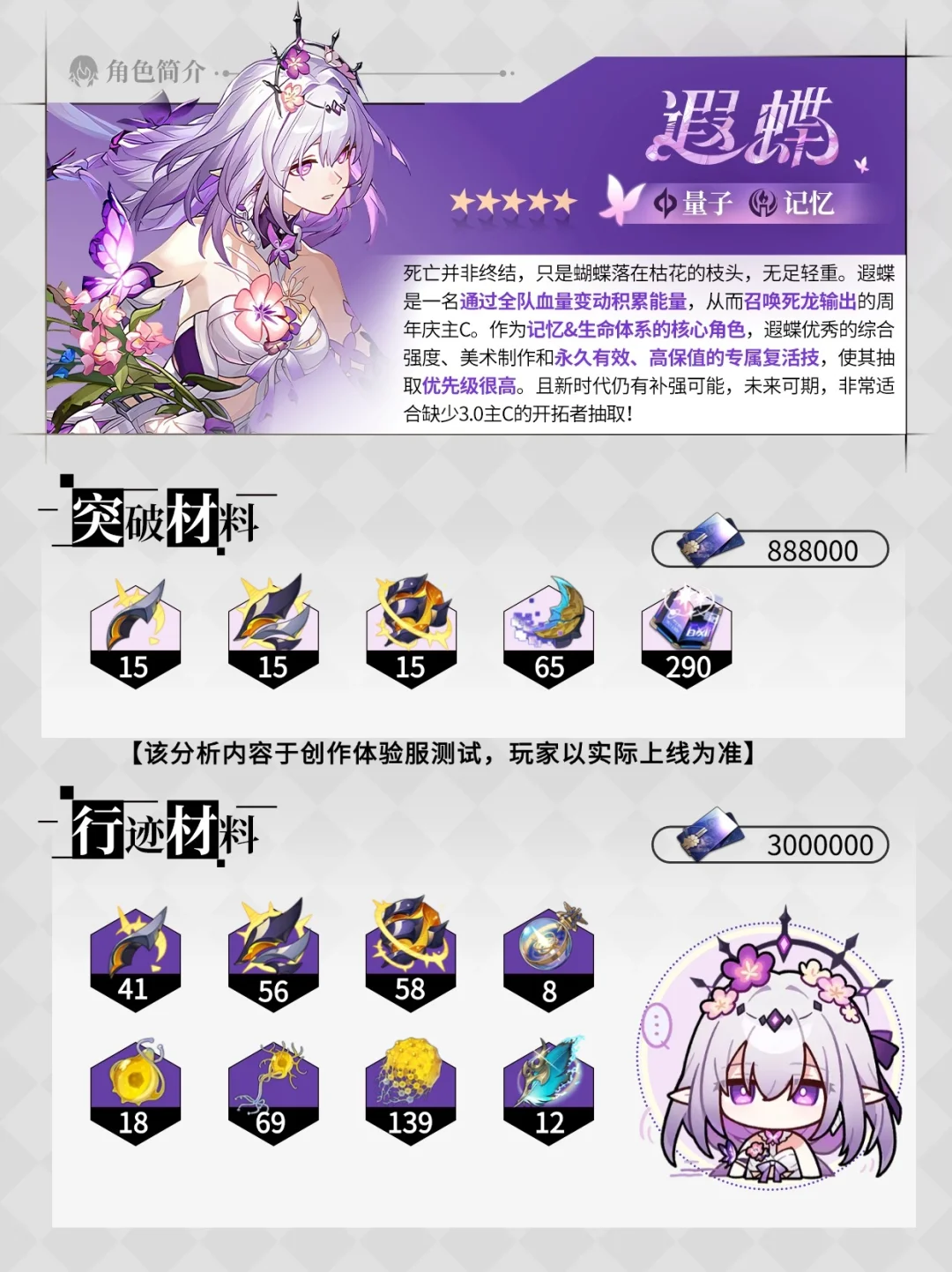 鼹鼠君来喽~ ≖‿≖✧ ▌遐蝶材料 | 行迹 | 光锥 | 遗器 | 配队|细节 ▌角色简介: 遐蝶是一名周年庆上线的记忆&生命体系的核心角色,综合强度+美术制作+专属复活技,非常适合缺少3.0主C的开拓者,抽取优先级很高! *该内容来自创作体验服,以实际上线为准 -------- 「生死皆为旅途,当蝴蝶停落枝头,那凋零的又将新生」