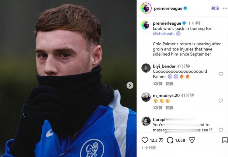 在周一的新闻发布会上,切尔西主帅马雷斯卡表示:"我们不确定具体时间,但帕尔默肯定很快就能回归。他已经踏上草坪进行有球训练,目前感觉良好。"