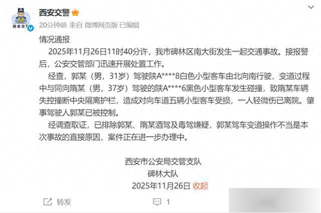 2025年11月26日11时40分许,我市碑林区南大街发生一起交通事故。接报警后,公安交管部门迅速开展处置工作。