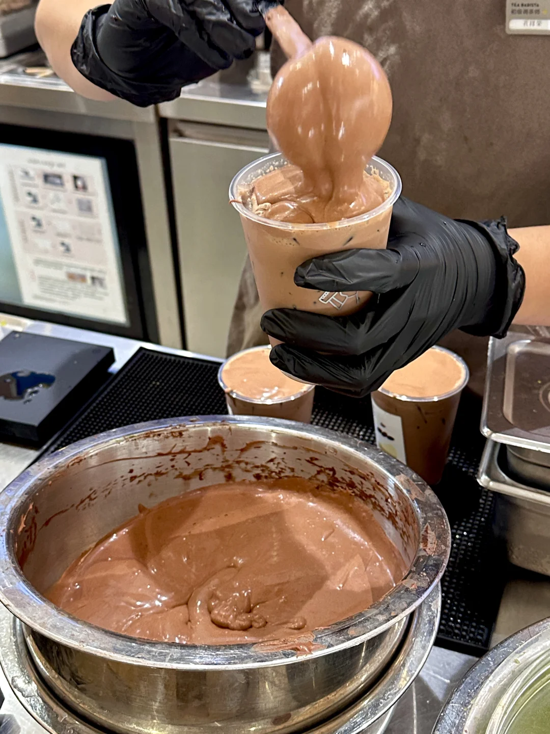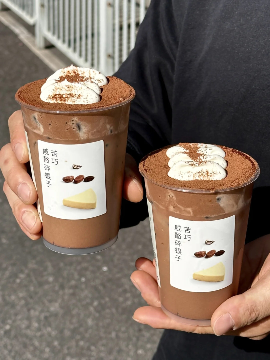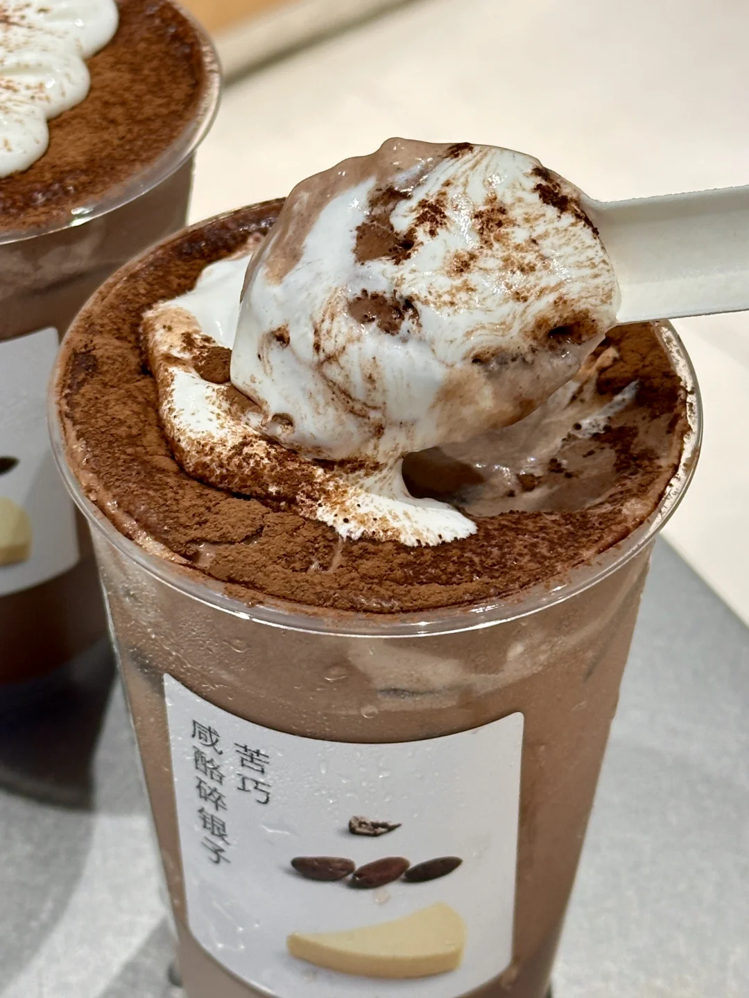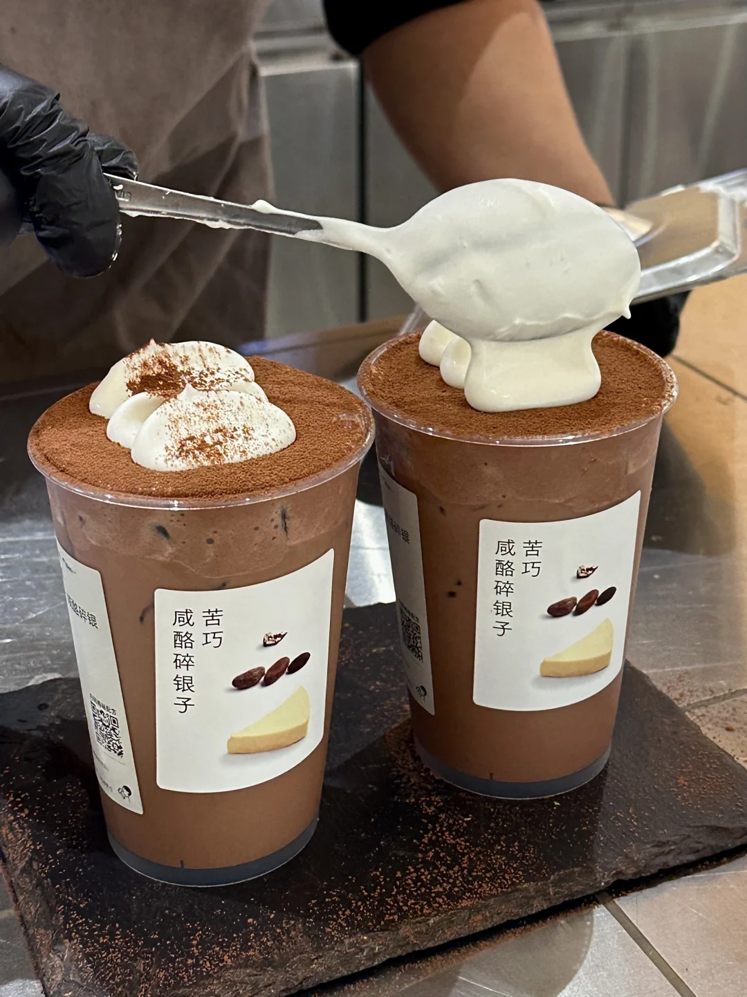 遇上了喜茶茶坊!都给我点这杯排队王! 苦巧咸酪碎银子! 巧克力🍫脑袋直接原地封神! 苦巧云顶奶盖厚到挖着吃! 有种在喝液体巧克力小蛋糕的感觉!好绵密! 底部的碎银子茶底藏着惊喜, 入口是滋味醇厚的糯香, 接着普洱茶的陈香慢慢冒出来, 品到最后糯香陈香相互交织, 再搭配上可可液,喝起来醇香又丝滑,能回味好久! 和咸香的奶酪中和的也刚刚好,不甜腻! 三重风味混合在一起,妥妥的咸甜永动机! 巧克力🍫脑袋真的会彻底沦陷! 全国只有4家啊!见到都给我多打包几杯!