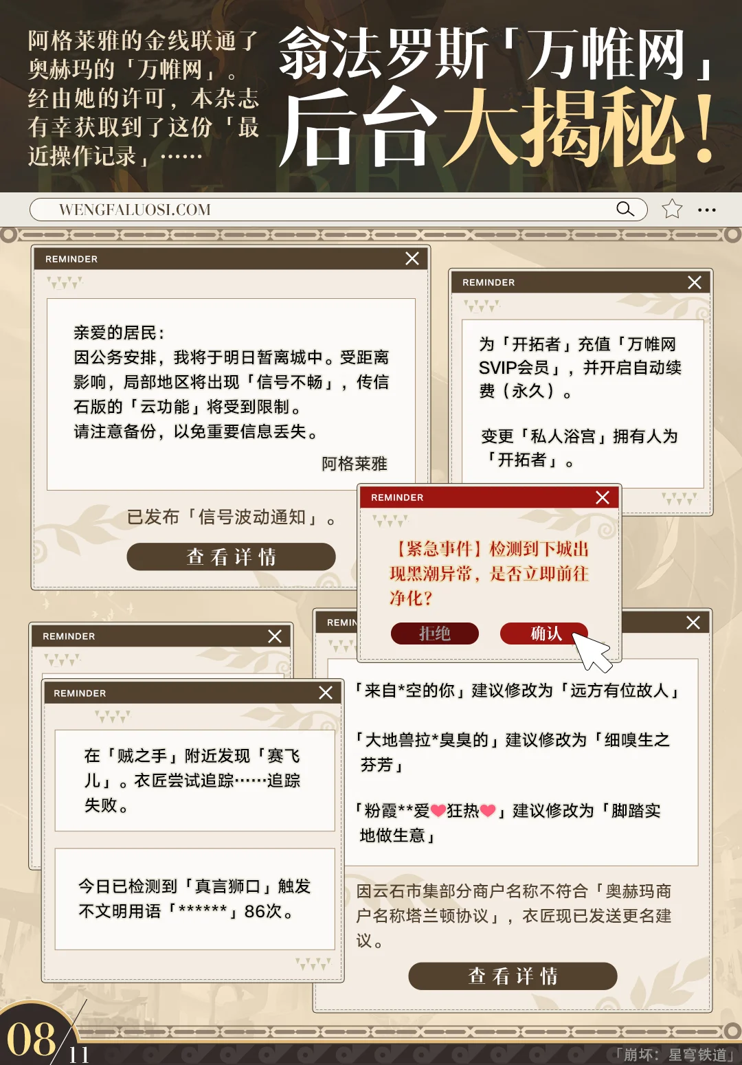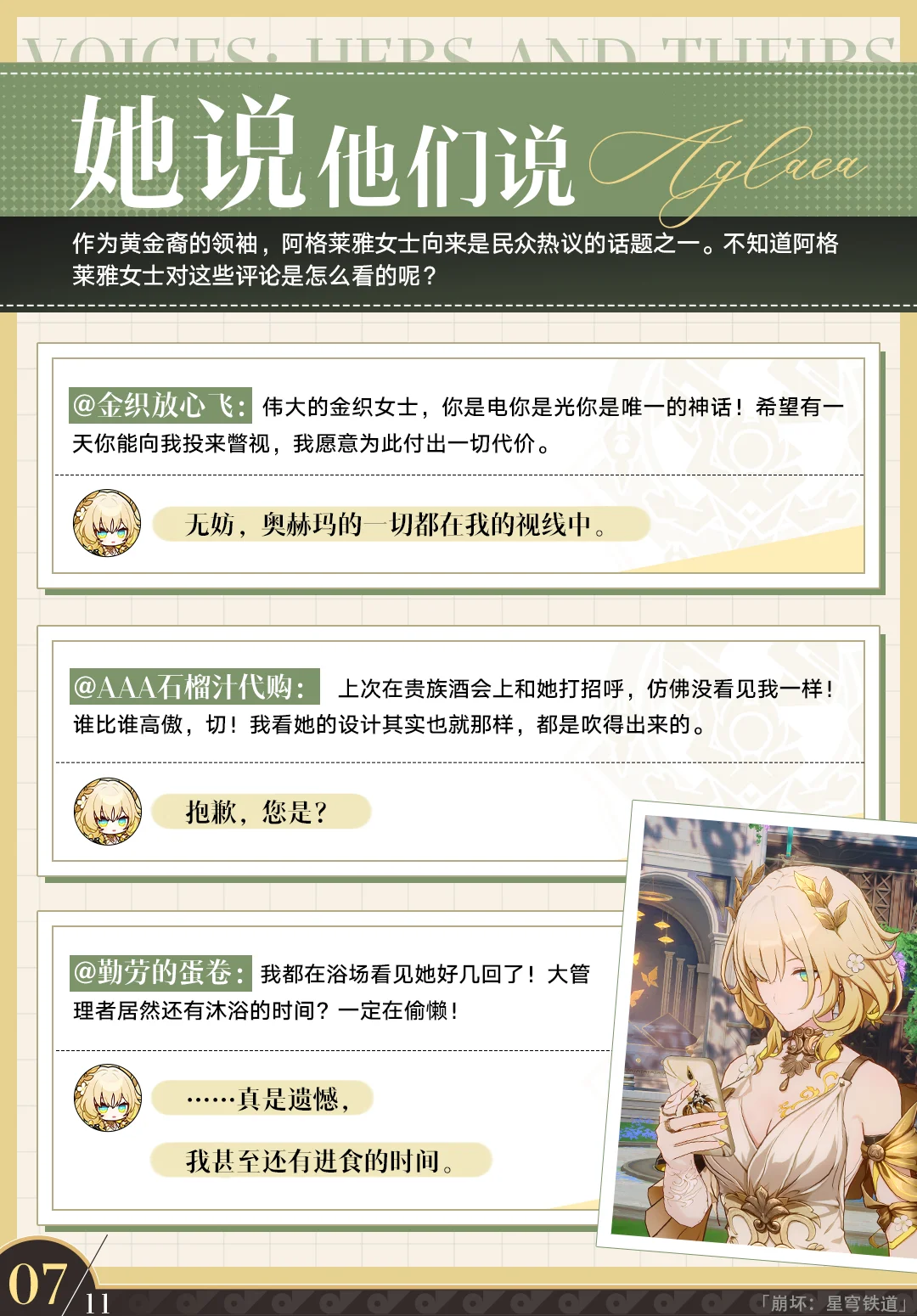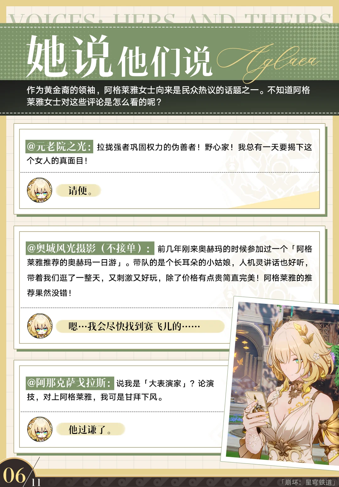 期刊好耶,下期是期待已久的缇宝老师[哇R] 信息量好大啊,万帷网到底怎么搞出来的?难道翁法罗斯真是个巨大的程序?阿格莱雅是管理员? 话说,那刻夏原来会是这种人设吗? 好毒的嘴啊哈哈哈哈哈(bushi),阿雅犀利回怼也好好笑[偷笑R],喜欢! 好看爱看请多写!希望可以出到13刊甚至更多!!!