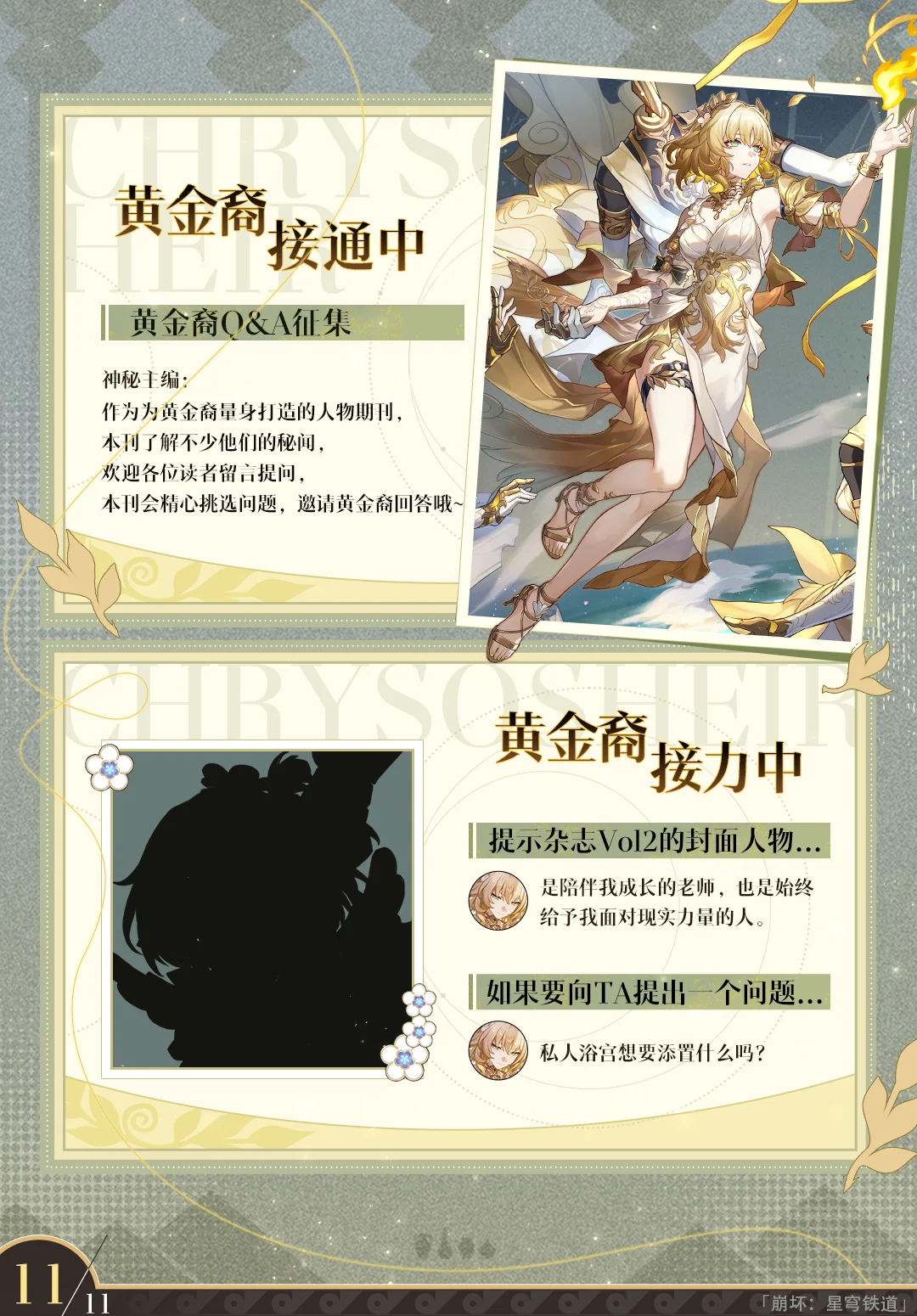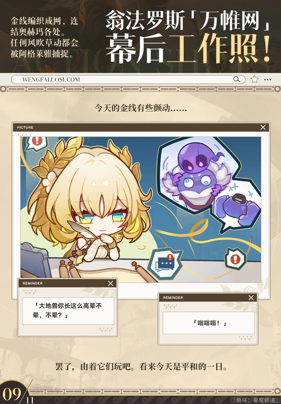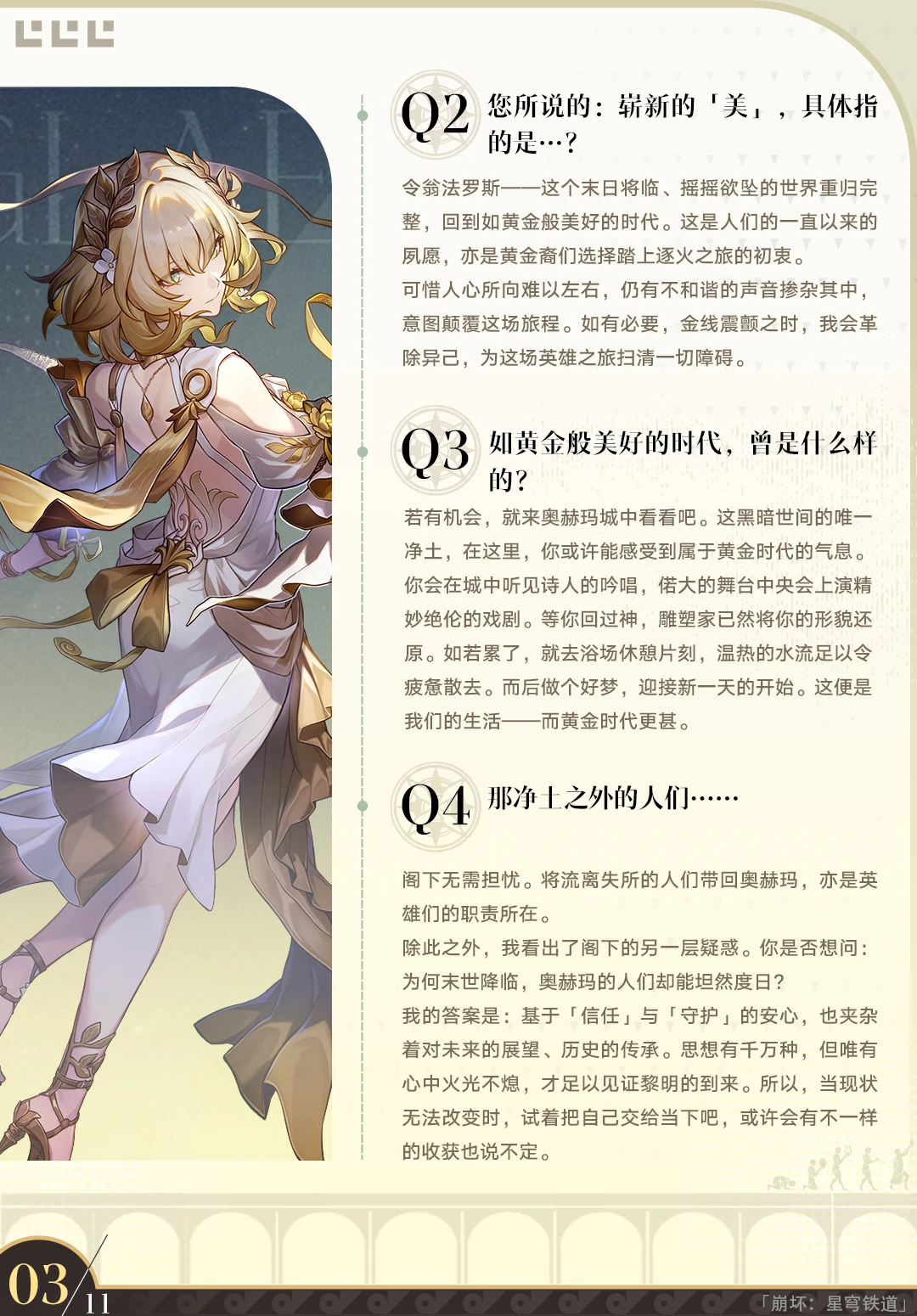 期刊好耶,下期是期待已久的缇宝老师[哇R] 信息量好大啊,万帷网到底怎么搞出来的?难道翁法罗斯真是个巨大的程序?阿格莱雅是管理员? 话说,那刻夏原来会是这种人设吗? 好毒的嘴啊哈哈哈哈哈(bushi),阿雅犀利回怼也好好笑[偷笑R],喜欢! 好看爱看请多写!希望可以出到13刊甚至更多!!!