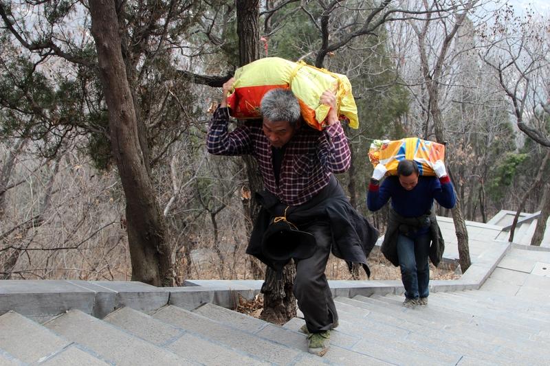 河南老君山景区 一直拒绝用无人机取代挑山工, 挑山工在景区住宿免费,每年发金扁担