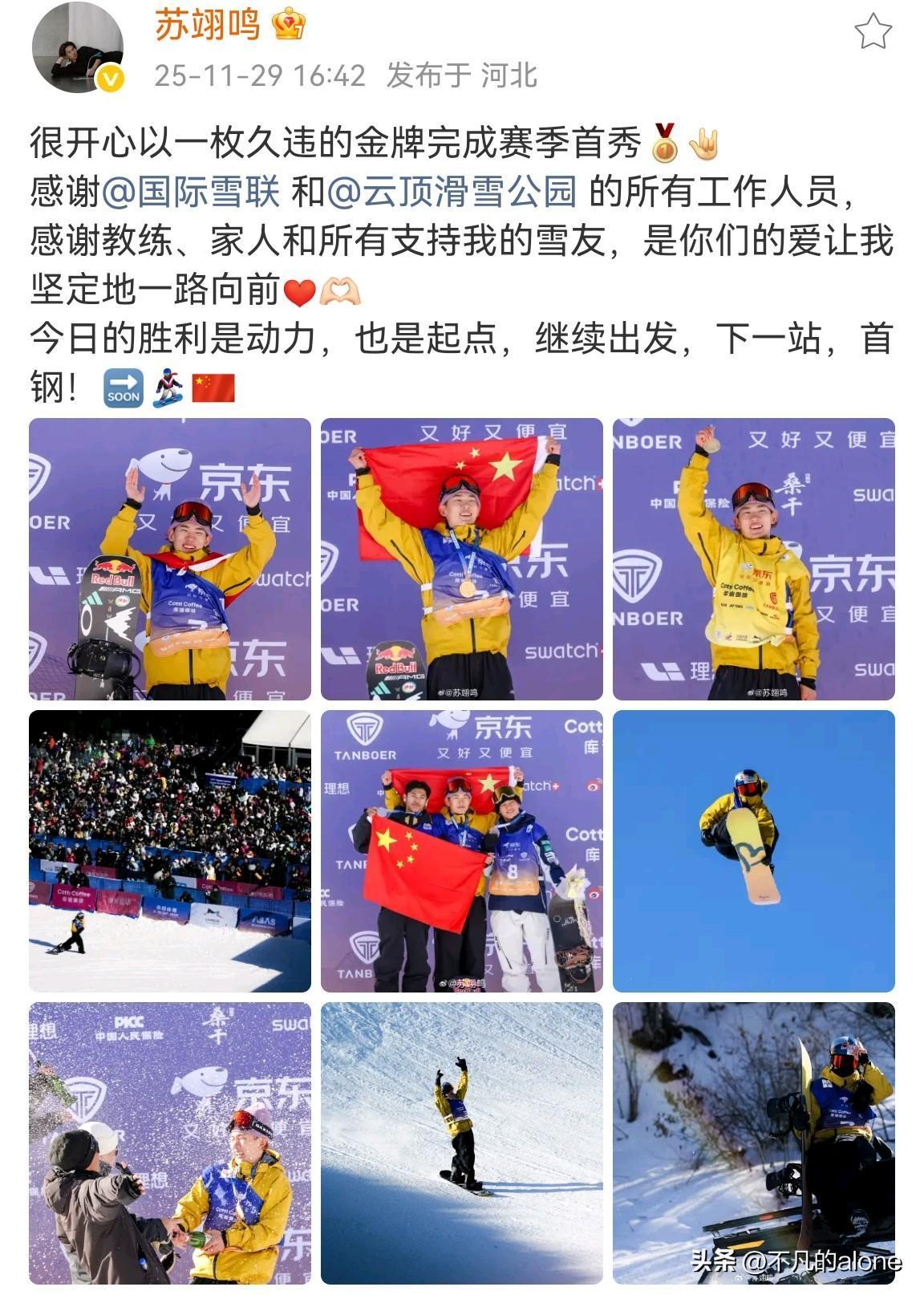 11月29日,苏翊鸣发文说:“很开心以一枚久违的金牌完成赛季首秀,今日的胜利是动力,也是起点,继续出发,下一站,首钢!” 苏翊鸣还感谢了所有工作人员、家人、教练和雪友,情商真好呀,而且他的英语口语非常流利。 苏翊鸣以174.50分强势夺得国际雪联大跳台世界杯云顶站冠军,这是他在米兰冬奥周期关键战役中的赛季首金。 葛春宇以159.50总分夺得该项目亚军,值得点赞。 苏翊鸣是冬奥会冠军,他和谷爱凌都是滑雪天才。此前,他还夸奖全红婵有滑雪天赋,主动邀约婵宝一起滑雪。 苏翊鸣在接受采访时表示:“这个冠军对他意义非凡,几乎等同于一切。” 最后,祝苏翊鸣在米兰冬奥会再创佳绩。