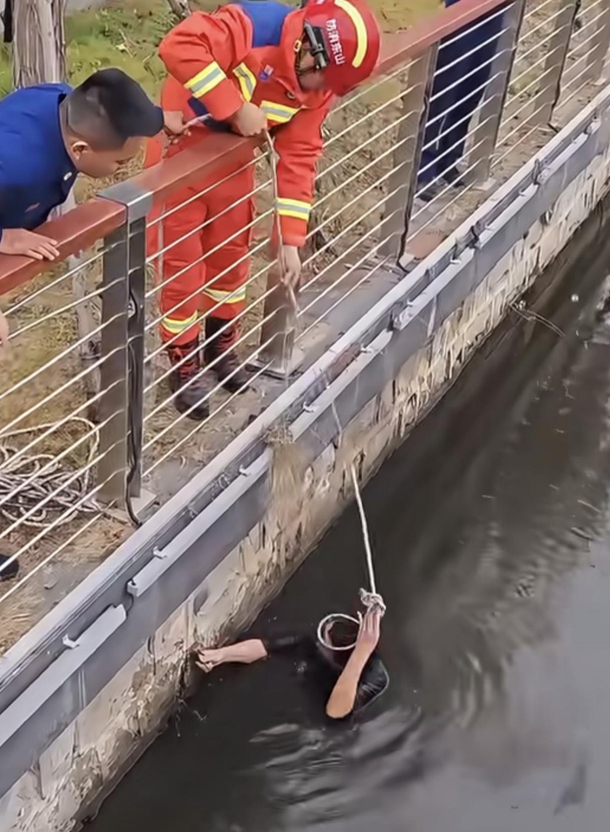 男子不慎落水 消防员拿绳索前来相救 男子拿起绳子就往脖子上套,消防员:我是来救你