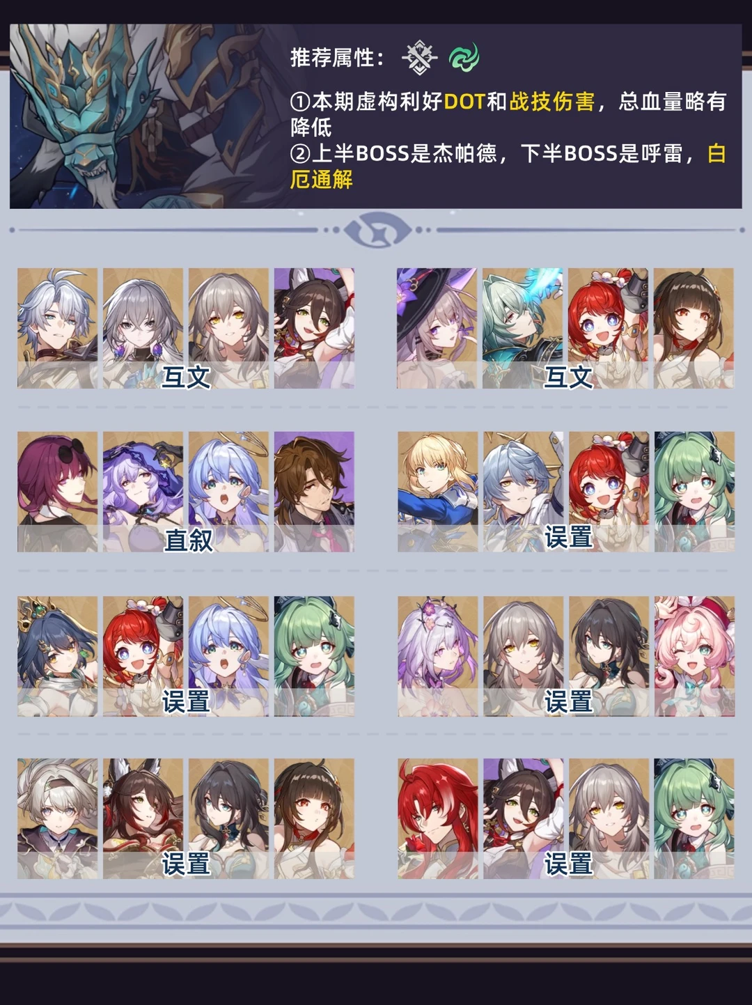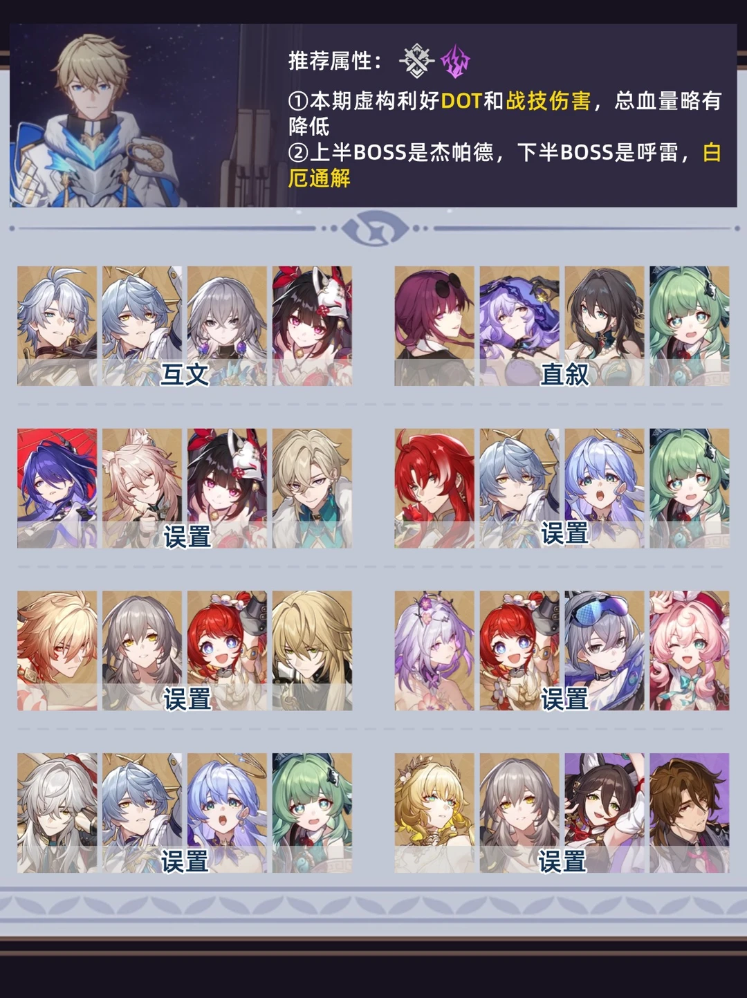 三幕架构作业在手,虚构天下我有[doge] ▌07/21-09/01,速来码住抄作业啦[哇R] 🔍小tip: ① 本期虚构利好DOT队和战技伤害 ② BOSS分别是杰帕德和呼雷,白厄上下通解 ———— 更多阵容推荐欢迎大家补充!我们下期再见👋🏻