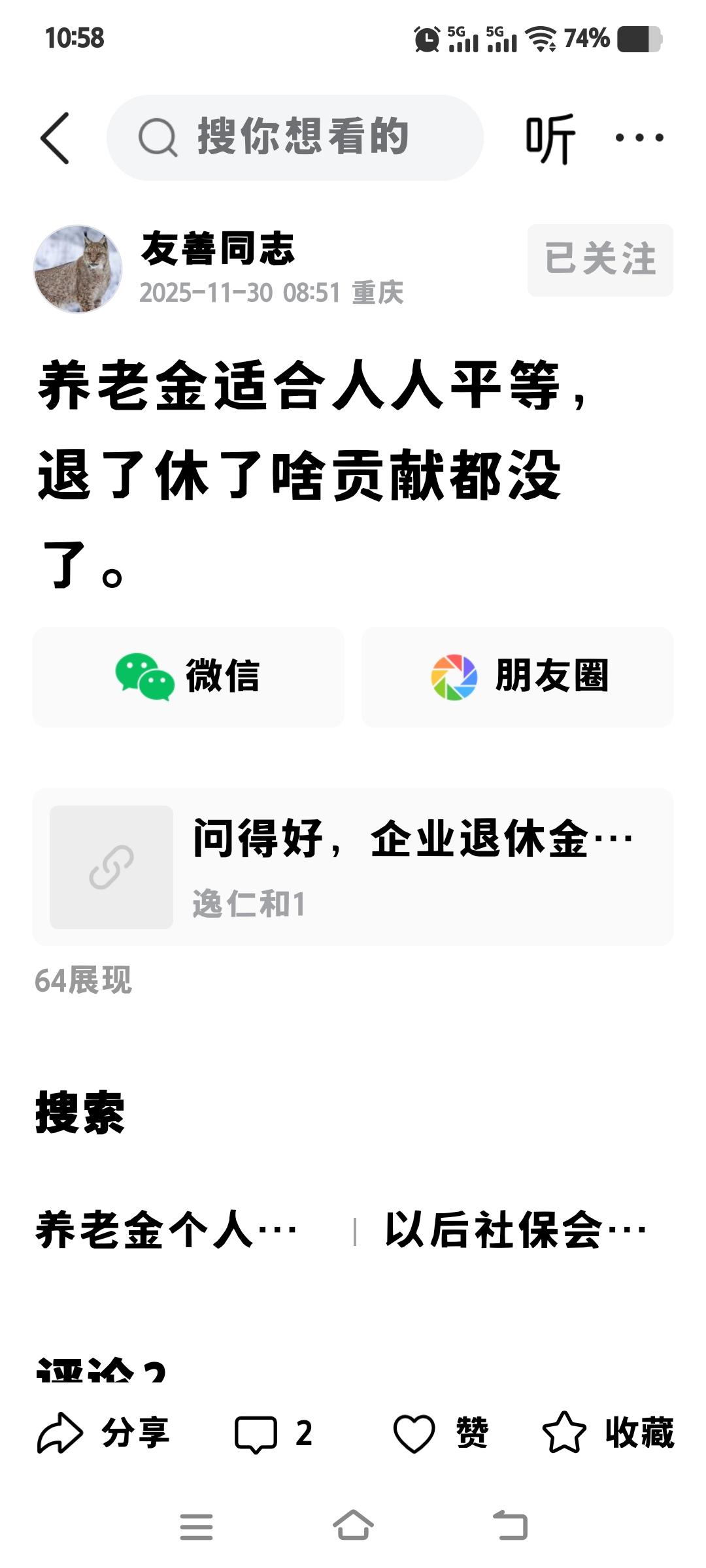 有网友说,退休了,没有贡献了,养老金应该人人平等。其实,在生活中老人退休了,没有工资了,人家在家养老了,是按月领回三四十年前交的养老保险费回来养老的。与贡献没有半毛关系。要明白,社保局不收贡献,也不发贡献。只核发养老金。