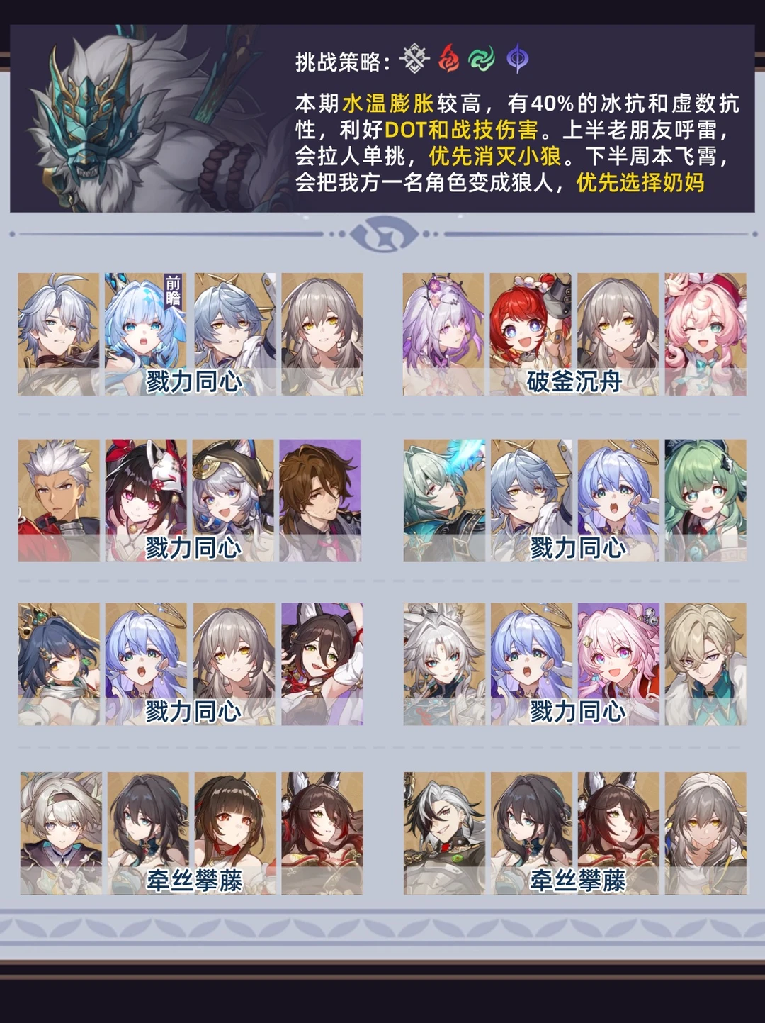 『天狼战首』作业在手,末日天下我有 ▌08/18 - 09/29,速来码住抄作业啦~~ 🔍小tip: ① 本期利好DOT和战技伤害,40%冰抗和虚数抗性 ② 上下半都需要优先削韧,推荐选阮梅和群攻角色 ③ 呼雷优先消灭小狼,周本飞霄优先选奶妈变狼人 —————— ฅ՞• •՞ฅ ——————— 更多好用的阵容推荐欢迎补充,我们下期再见啦👋🏻