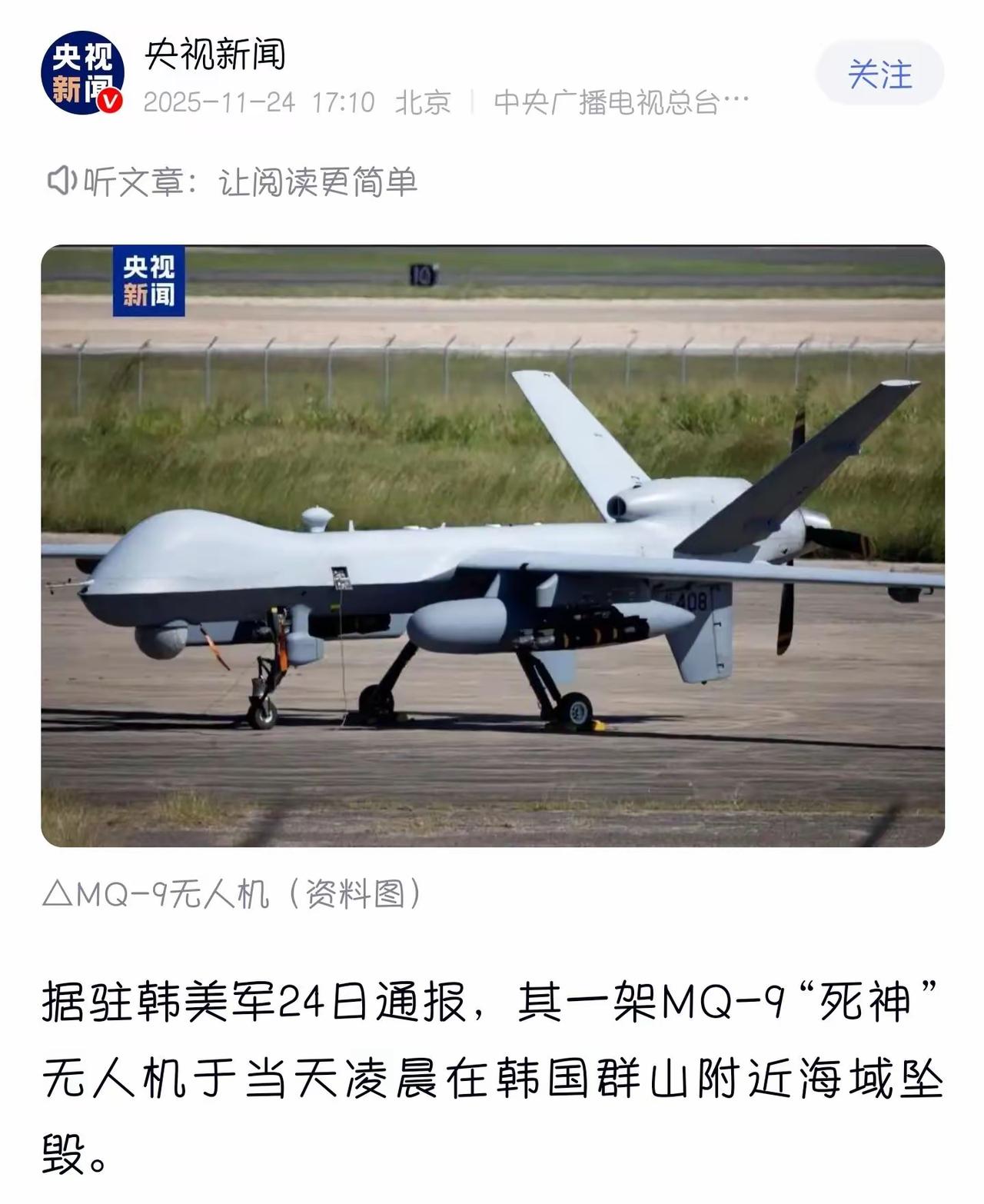 奇怪的是:价值3000万美元的美军无人机,一靠近中国就坠毁,关键是还两次,更蹊跷的是美军立马澄清是自己问题跟中国无关…… 其实说价值3000万美元也不太正确,这款美军的MQ-9A死神攻击无人机卖给印度31架,每架1.3亿美元,卖给卡塔尔更离谱了,8架20亿美元,也就是每架2.5亿美元!史密斯专员拿的真的有点太多太多了啊…. 今年9月,31架MQ-9刚在韩国群山基地落地,美军就急吼吼宣称要“24小时盯紧黄海”。谁能想到,这号称“能在1.2万米高空蹲守27小时”的“死神”,两个月不到就成了“水鬼”。 更绝的是,坠毁时正值中国军演,美军不等打捞就忙不迭澄清“自己摔的,和中国无关”,这反应比当年F-35C坠南海时还慌乱,毕竟那次捞了70天,这次连黑匣子都没找到,黄海的暗流怕是早把“死神”的秘密冲进了太平洋。 根据国会报告,MQ-9的A类事故率比普通军机高15%,光2023年就摔了4架。这次坠毁的无人机,从群山基地起飞时,发动机已经连续工作了187小时,按照维护手册,早该返厂大修。 但驻韩美军的地勤团队,正忙着给31架新到的无人机“赶工贴膜”——没错,连机身涂层都是临时找韩国企业喷的,省钱省到连防腐底漆都省了。 这种“带病上岗”的操作,让MQ-9的螺旋桨轴承比设计寿命早报废了300小时,出事只是时间问题。 最讽刺的是“中间商赚差价”的戏码。卡塔尔买的2.5亿版本,标配电子战吊舱和反干扰系统,而美军自己用的“简配版”,连最基本的电磁屏蔽都没做——毕竟史密斯专员的回扣,都藏在“选择性阉割”的配置单里。 当黄海的电磁环境稍微“热闹”点,这些没穿“防弹衣”的无人机,就像没头苍蝇一样乱窜。 11月24日那次坠毁,地面控制站的屏幕上,导航信号突然变成了“俄罗斯方块”,这种低级故障,在中东战场早让3个地勤被开除了,可在亚太,却成了“不可抗力”。 美军急于撇清关系的另一个原因,是怕掀开“天价装备”的遮羞布。今年6月,印度空军刚接收的MQ-9,在克什米尔摔了两架,调查发现竟是发动机螺丝没拧紧而这些螺丝,正是史密斯专员指定的“特惠供应商”提供的。 现在黄海坠机的残骸里,但凡捞出一颗带编号的螺丝,都可能牵扯出横跨三大洲的利益链。所以美军宁可让无人机泡在海底喂鱼,也不敢让第三方碰,毕竟2.5亿和3000万的价差,足够让整个亚太采购体系的盖子被掀开。 两次坠机,暴露的是美军“数字建军”的荒诞。他们在PPT里把无人机吹成“永不疲倦的哨兵”,却忘了黄海不是叙利亚沙漠。这里有15米厚的海底淤泥,有2.5米/秒的暗流,还有每隔4小时就变向的潮汐。 当美军的打捞船用着2010年的声呐设备在海底捞针时,中国渔民早就在出事海域捞起了几块带编号的残骸——这些“漂流瓶”里的秘密,怕是比3000万美元的标价更让五角大楼睡不着觉。 说到底,史密斯专员们的“油水”,都浇在了亚太的火药桶上。当31架MQ-9在群山基地的跑道上排队等着“带病起飞”。 当维护手册被改成“能飞就行”,当电子战系统的预算变成了私人账户里的数字,这种“纸面强大”的无人机部队,注定只能在黄海续写“死神来了”的笑话。