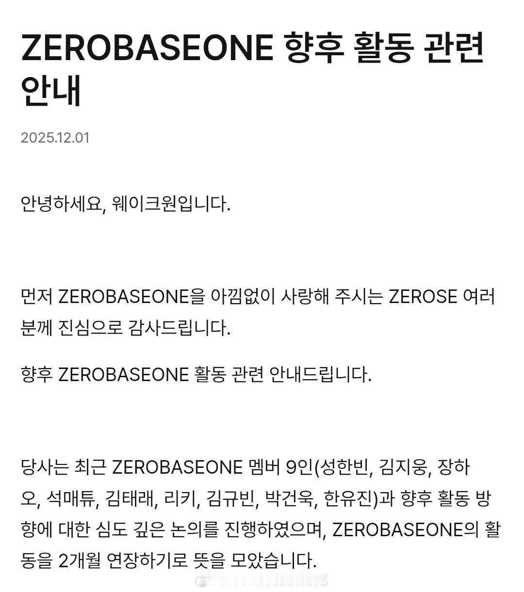 ZB1官方发文称所有成员合约将延期两个月ZB1组合合约延期两个月ZB1成员合约延期两个月