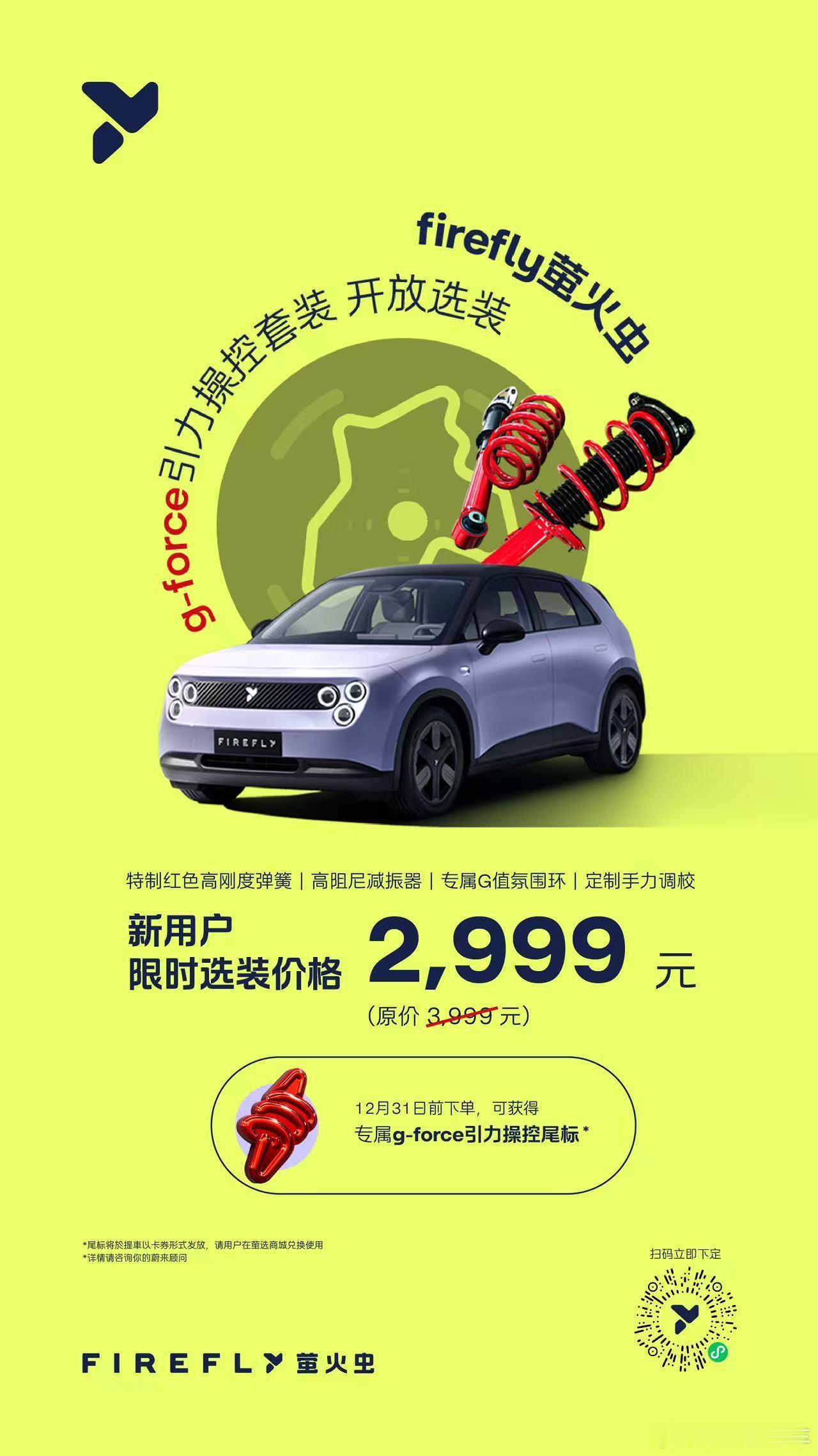 萤火虫可以改装了,这你上哪说理去?firefly萤火虫自上市以来,每10个用户帖,就有6个提到“好开”!😎小虫子十分“听劝”、实力“宠粉”~正式向所有用户开放g-force引力操控套装选配!11月22日起,新用户3,999元可选装、已购车用户4,599元可改装!12月31日前,新老用户均可享受2,999元限时优惠价格,更可获得的g-force引力操控尾标专属标识🤩为用户带来更极致的城市驾驶乐趣!💡firefly萤火虫对“好开”的理解,是希望驾驶时:你、firefly与城市、道路可以达成一种默契,使得驾驶更加自在可控!🛞于是有了“车随心动,自在掌控”的「心流操控哲学」!firefly萤火虫让驾驶体验更爽、更开心!