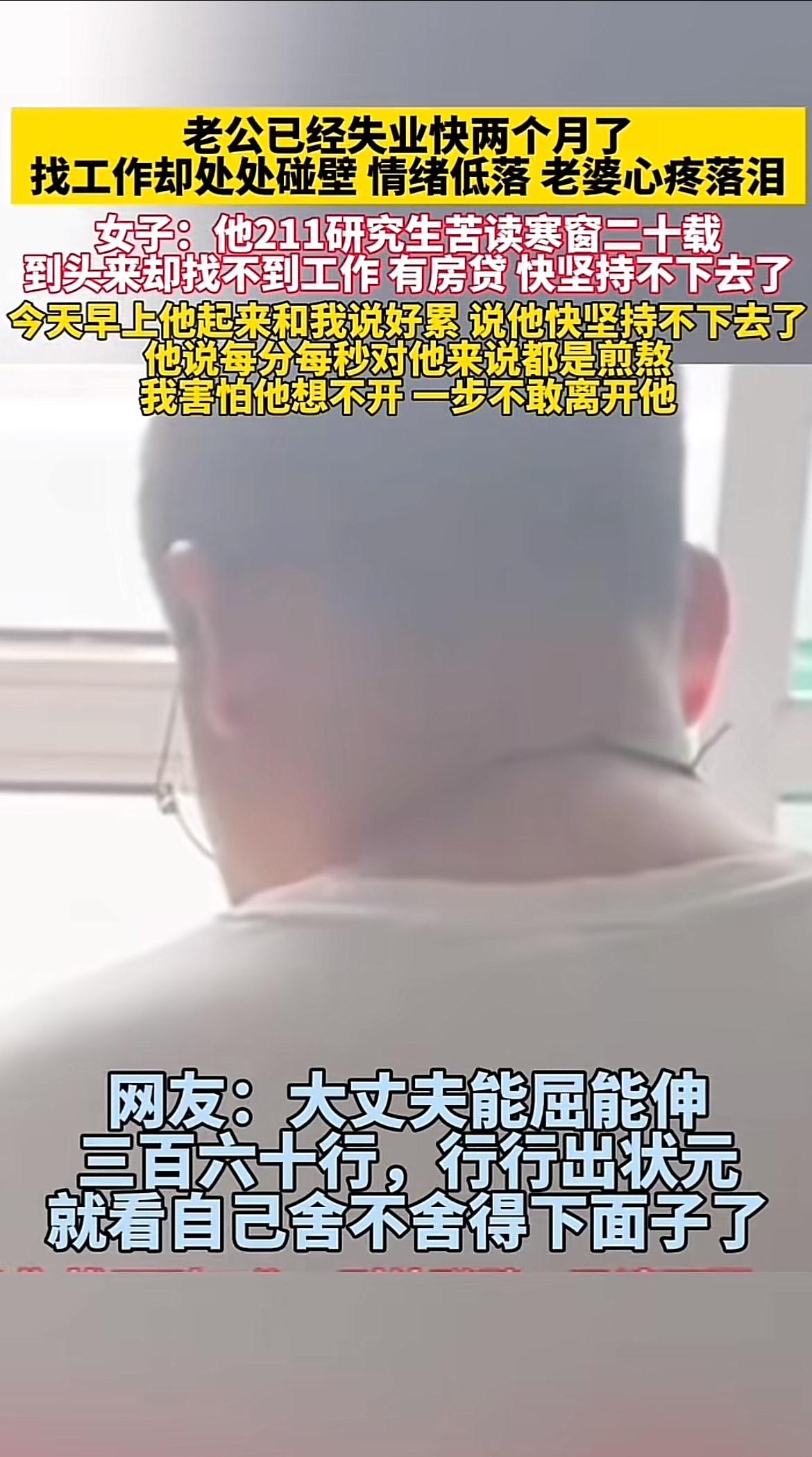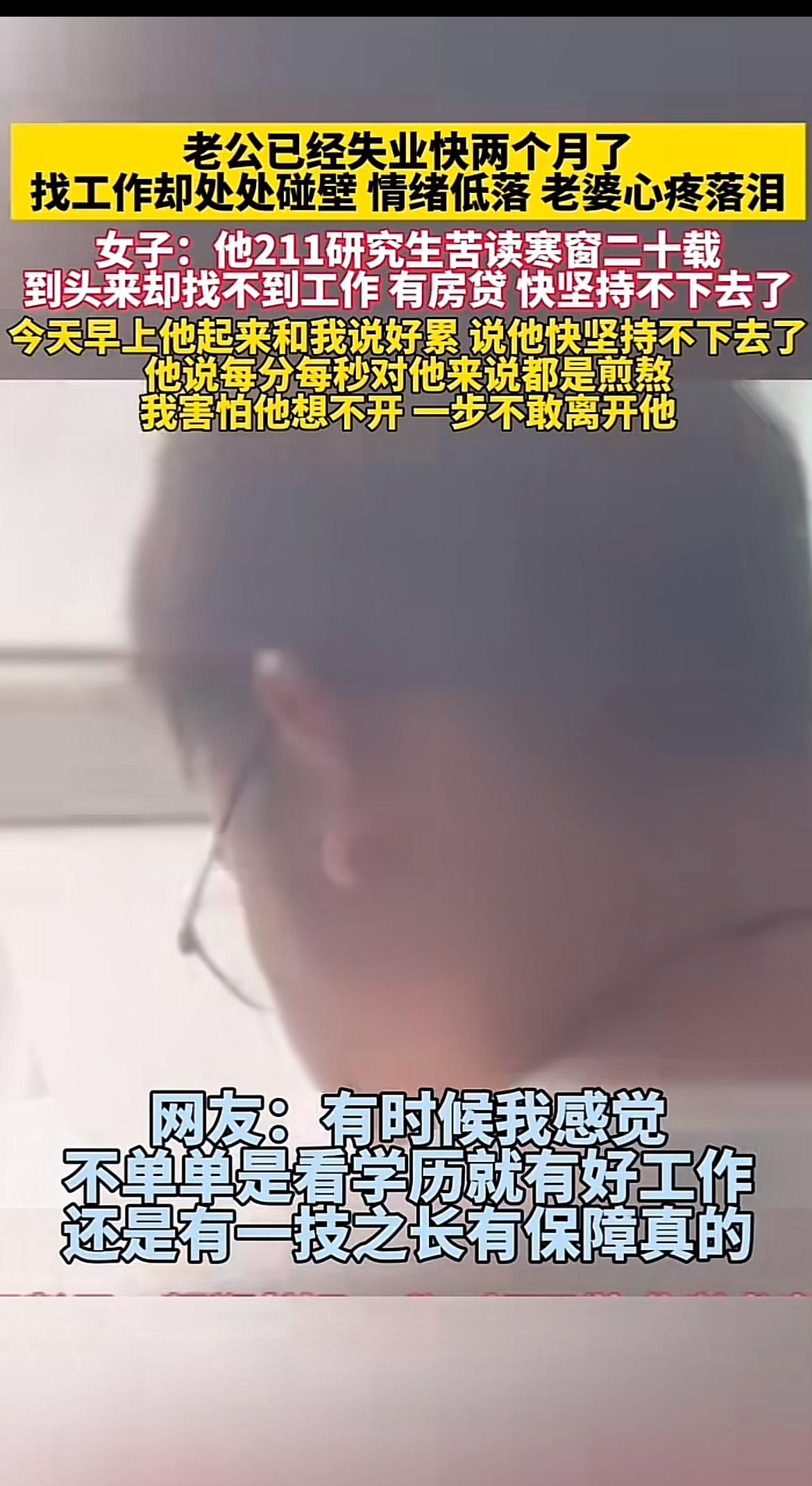 211研究生失业俩月找不到工作,老婆心疼落泪,这事儿听着就让人揪心。这位老公是合肥工业大学土木工程专业的,曾经这专业可是香饽饽,211的学历更是找工作的“硬通货”。可房地产行业一不景气,他还是被裁了,几个月都没找到合适工作。房贷还不上,未来渺茫,他信心全失,常坐在阳台发呆。 他老婆崩溃大哭,真怕老公想不开。这也反映出现在就业市场变幻莫测,哪怕学历高、专业好,也可能遭遇失业危机。学历不代表一切安稳,行业变迁才不管你曾经多优秀。希望他能快点振作起来,度过难关。