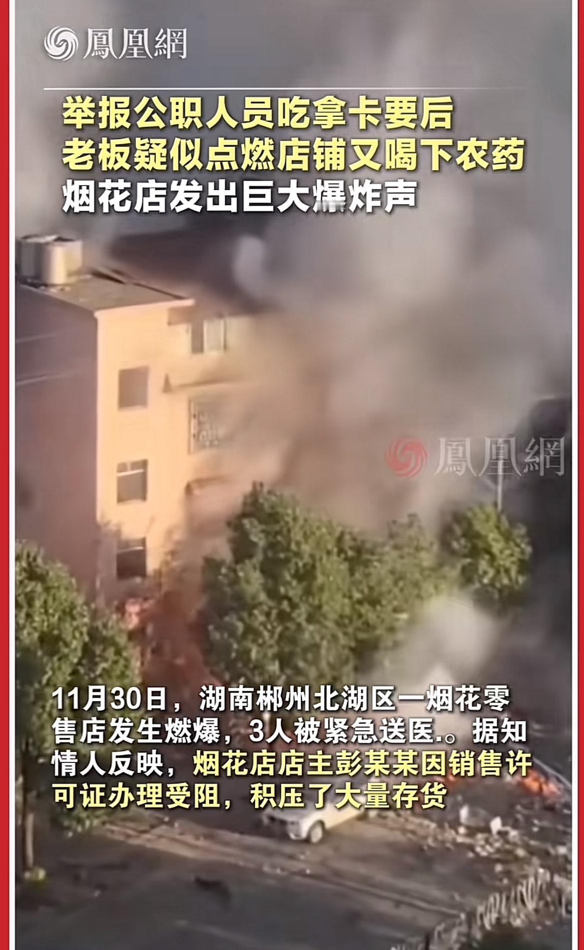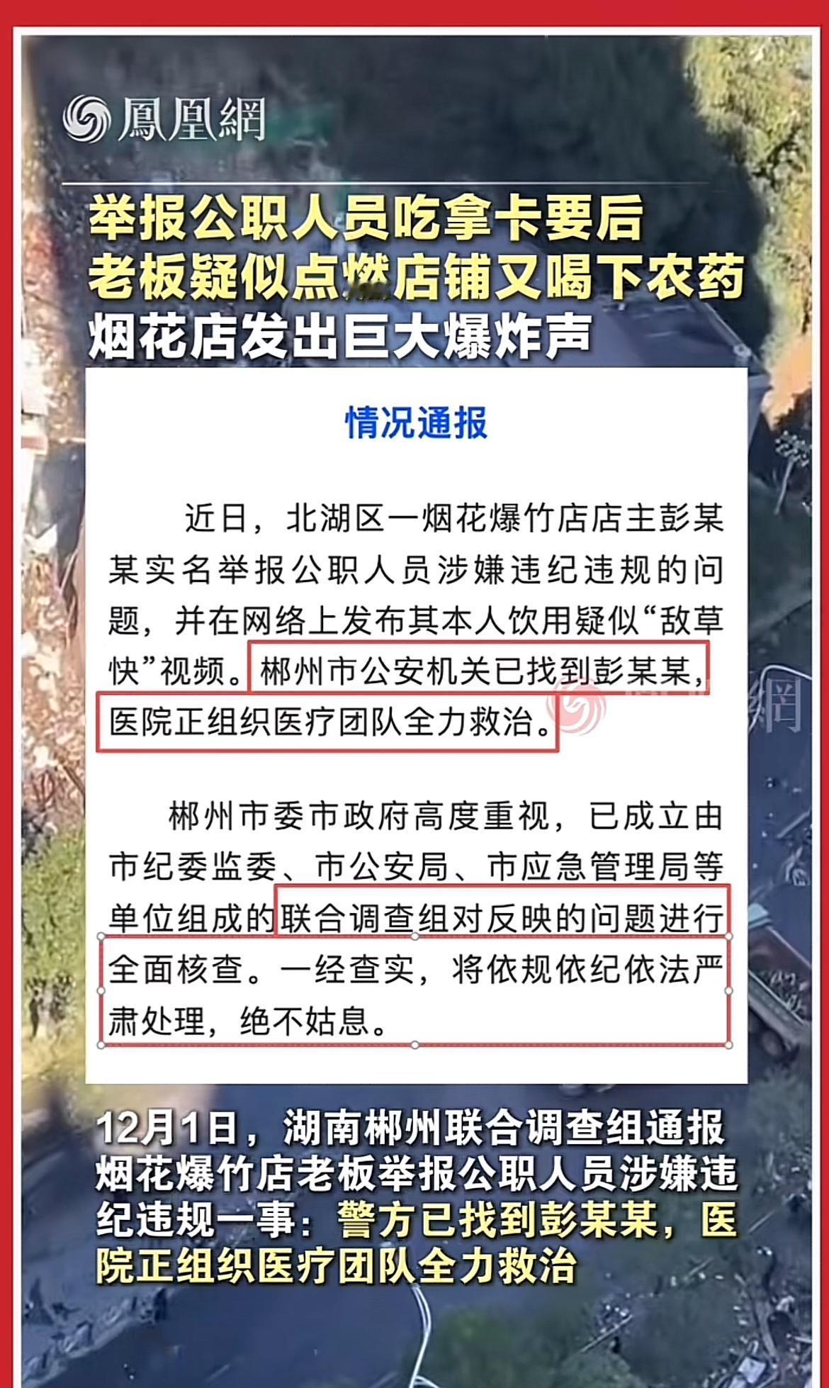 最近湖南郴州这事儿闹得挺大。11月30日,北湖区一烟花零售店燃爆,3人送医。知情人说店主彭某某销售许可证办不下来,积压了1000多万的货准备过年卖。此前他实名举报公职人员违纪违规,还发了喝疑似“敌草快”的视频。“敌草快”口服致死量才5 - 15毫升,没特效解药,救治难。 12月1日联合调查组通报,已找到彭某某全力救治。市委市政府重视,多部门组成调查组全面核查。若问题属实必严肃处理。希望能尽快查明真相,给大家一个交代,也祝愿彭某某能挺过来。