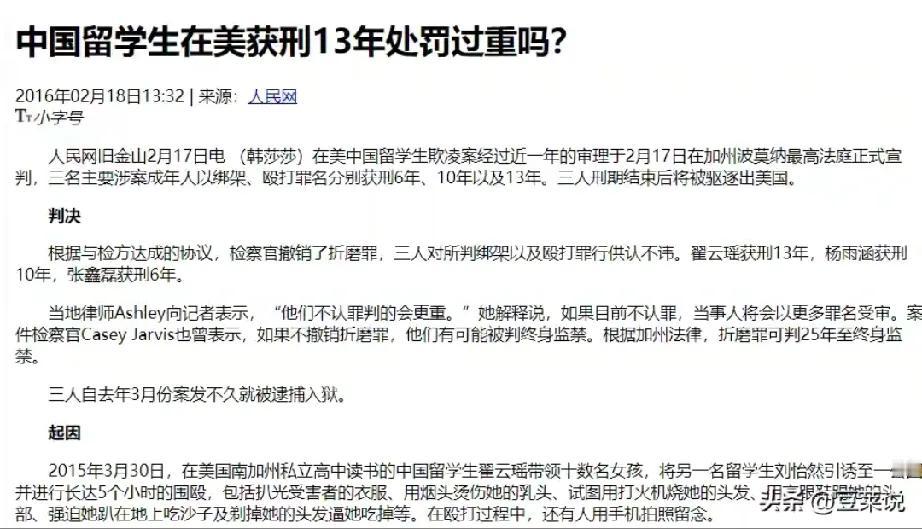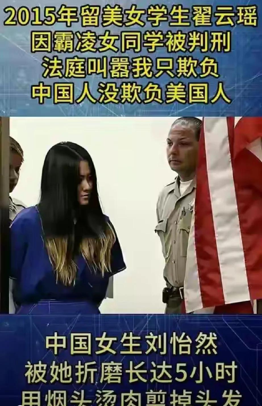 “我只欺负中国人!”2015年,留美中国学生翟云瑶的这句嚣张话,震惊全网!她伙同他人,将同胞骗至公园,折磨长达5小时,手段残忍至极。 本是富家女的她,因父母忙于赚钱,缺乏陪伴,性格变得极端自我。到美国后,她非但没改,反而拉帮结派,专挑中国留学生下手。 最终,她因绑架罪、酷刑罪被判13年,出狱即驱逐。如今她可能已回国,但当年的伤害,却给受害者留下了一辈子的阴影。 翟云瑶的故事警示我们:霸凌不是小事,做人别太横,人品教育比金钱更重要! 那些被校园霸凌的人最后怎么样了 你认为明星乔欣美吗?