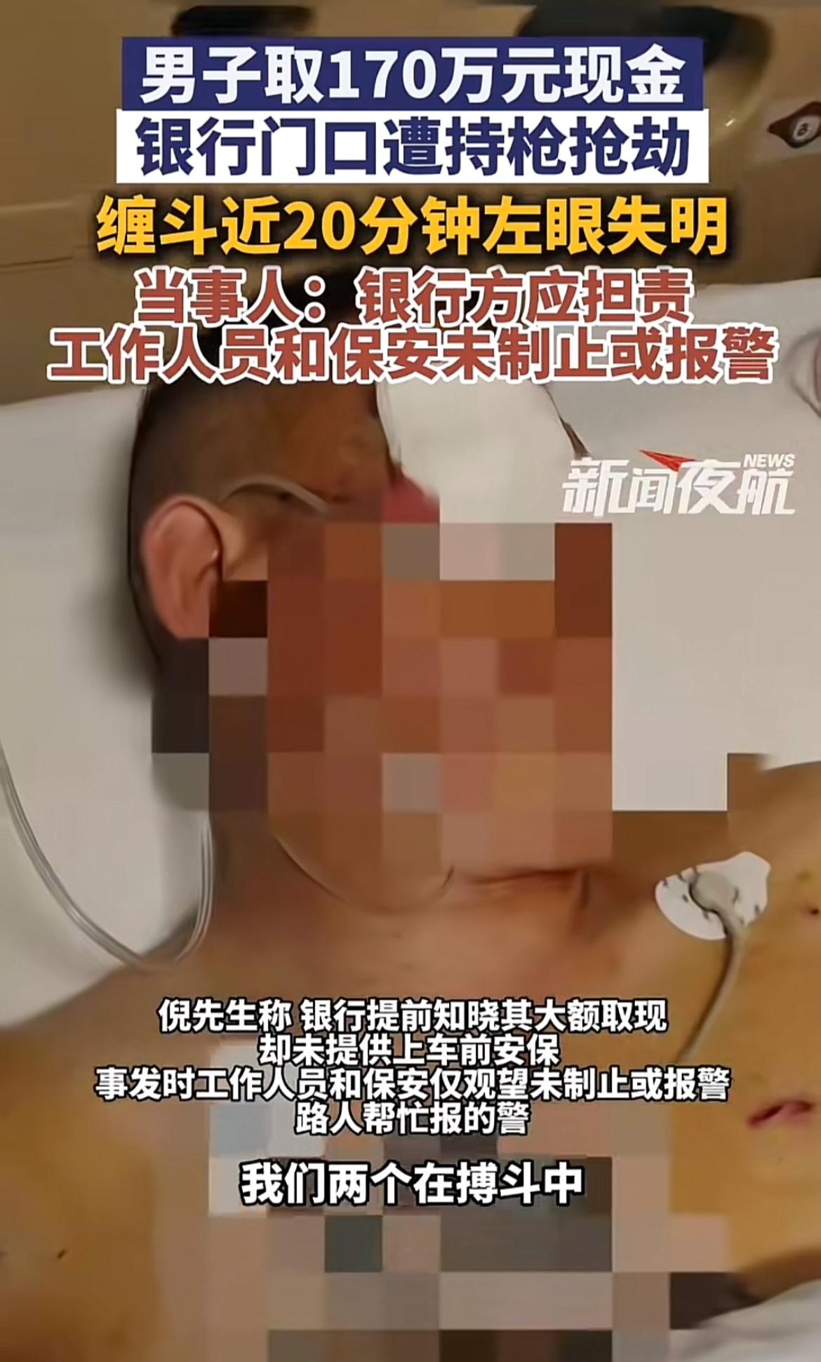 河南郑州的倪先生可太惨了。去年7月,他在农行中牟白沙支行取了170万现金,刚走出银行大门几米远,就遭遇持枪歹徒抢劫。他和歹徒缠斗了近20分钟,这期间银行工作人员和保安就在门口干看着,既不上前制止,也不报警,最后还是一名路人帮忙报了警。倪先生面部受重伤,左眼都失明了。 事后歹徒被抓判了死缓,但倪先生觉得银行也有责任。他提前预约大额取款,银行本应保障他和钱在上车落锁前的安全。可银行领导却一味推诿。这事儿银行做得真不地道!
