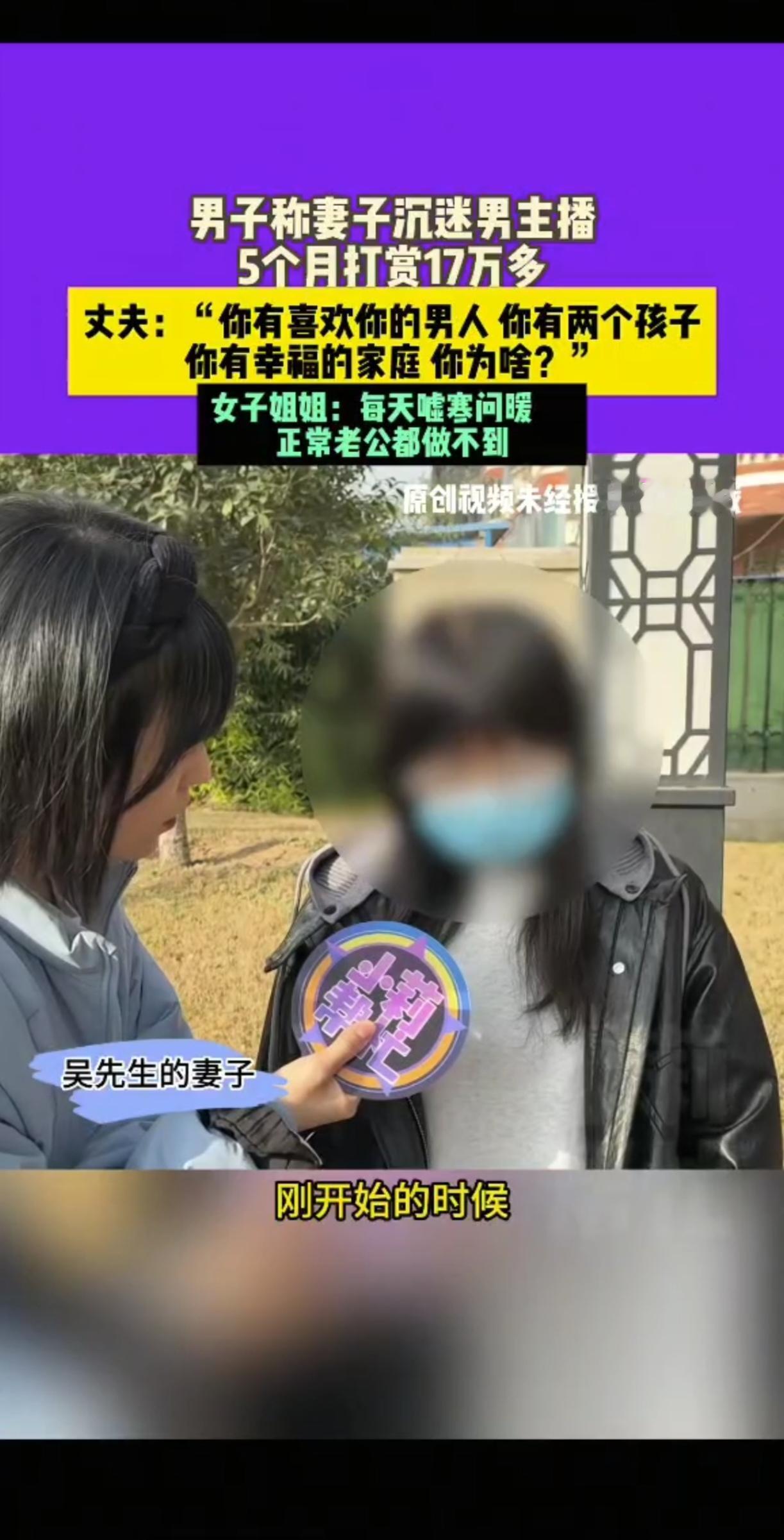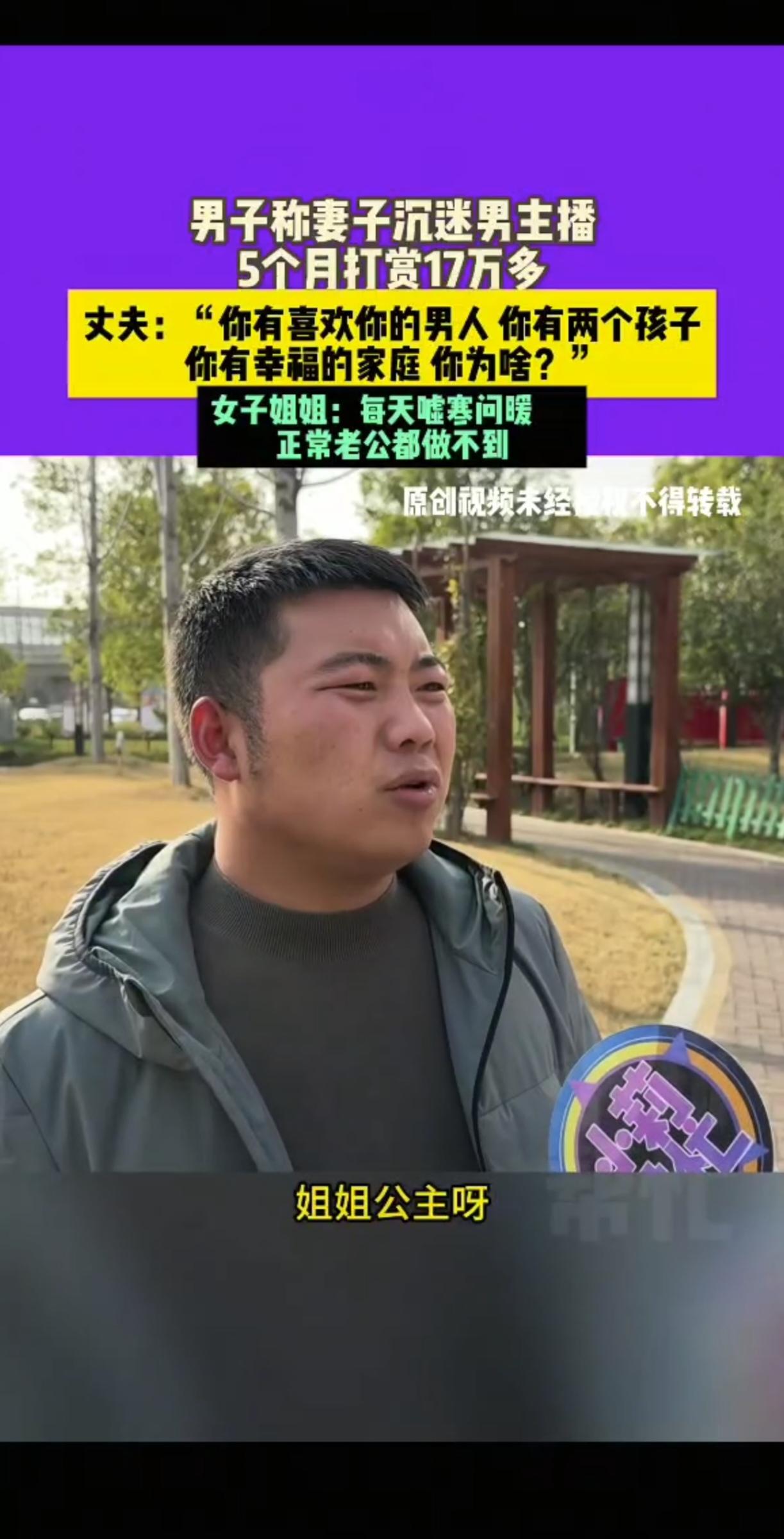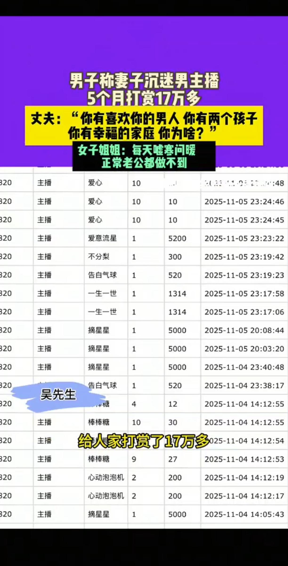 “色即是空”!郑州有位已婚女子,在短短五个月内打赏男主播17万元。丈夫发现后,痛苦又无奈地质问妻子:“你有喜欢自己的男人,有幸福的家庭,还有两个孩子,为何要这么做?”妻子坦言:“我喜欢他,他对我很好,每天都嘘寒问暖,这是你做不到的。” 吴先生拿着妻子的手机账单,手都在发抖。他找到妻子李女士,把手机往她面前一放:“你看看,这五个月你到底花了多少钱?两个孩子的奶粉钱、学费,你都不管了吗?”李女士瞥了一眼,小声说:“我就是觉得他直播间气氛好,他也会关心我。” 吴先生气得胸口发闷,他怎么也想不通,自己在外辛苦打拼,妻子却把家里的积蓄都用来打赏一个素不相识的男主播。“他关心你?他是关心你的钱吧!每天‘姐姐辛苦了’‘姐姐公主’地叫着,把你捧得晕头转向,你就心甘情愿把钱往他口袋里送?” 李女士被说中了心思,脸涨得通红,却还是嘴硬:“他就是比你懂我,比你会关心人。你除了赚钱,还会干什么?” 这话像针一样扎在吴先生心上。他知道自己平时忙于工作,对妻子确实少了些陪伴,但也不能因此就把家当败光啊。他找到那个男主播所在的传媒公司,公司里的工作人员一开始还推三阻四,说要核实情况。吴先生急了,嗓门也大了起来:“我老婆五个月给他刷了十七万,你们就这么赚黑心钱?” 旁边的民警见状,赶紧出来调解:“大家都冷静点,有事好好说。看看能不能协商退一部分钱。”传媒公司的人这才松口,说下午让主播和吴先生见面谈谈。 回家的路上,吴先生心里五味杂陈。他不知道这场见面能不能要回钱,也不知道妻子能不能真正醒悟。他只希望,经过这件事,妻子能明白,那些直播间里的甜言蜜语都是假的,只有眼前的家和孩子才是真的。 各位读者你们怎么看?欢迎在评论区讨论。 来源:小莉帮忙 2025-12-1采访