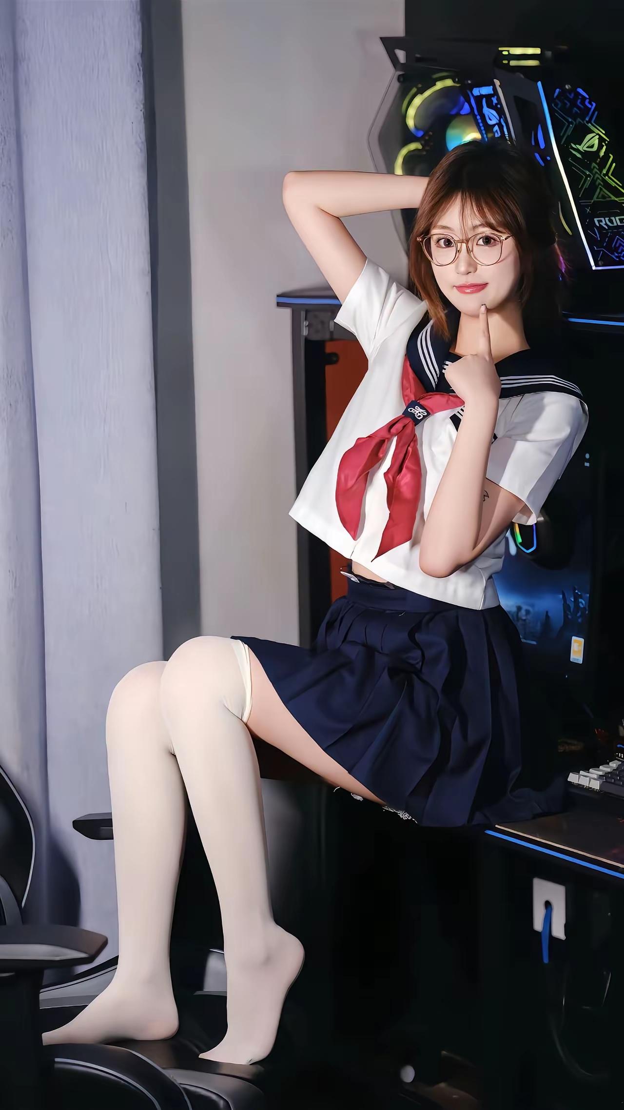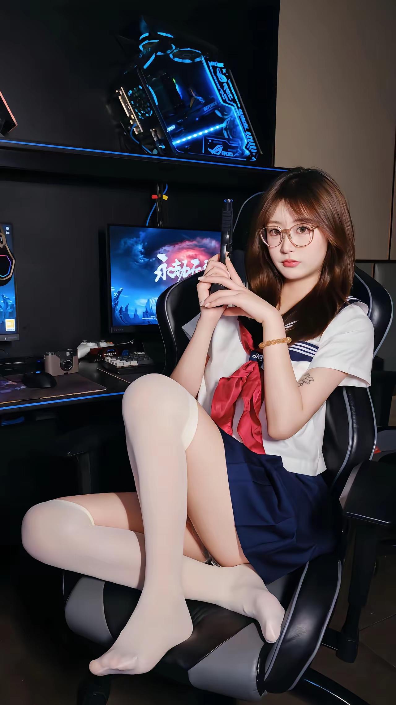 可爱少女在电竞椅上思考,背景是炫酷的电脑和游戏海报