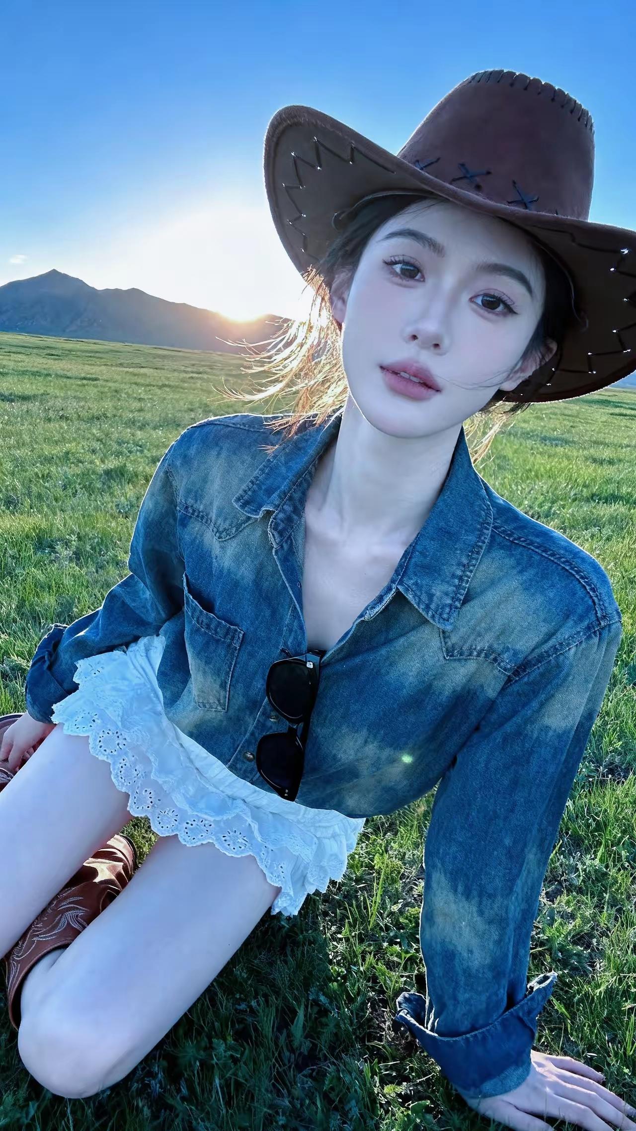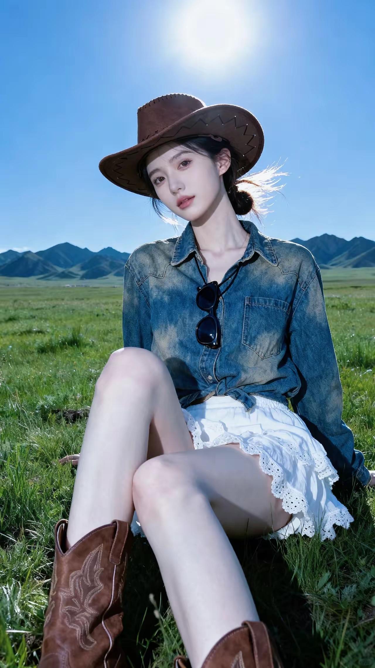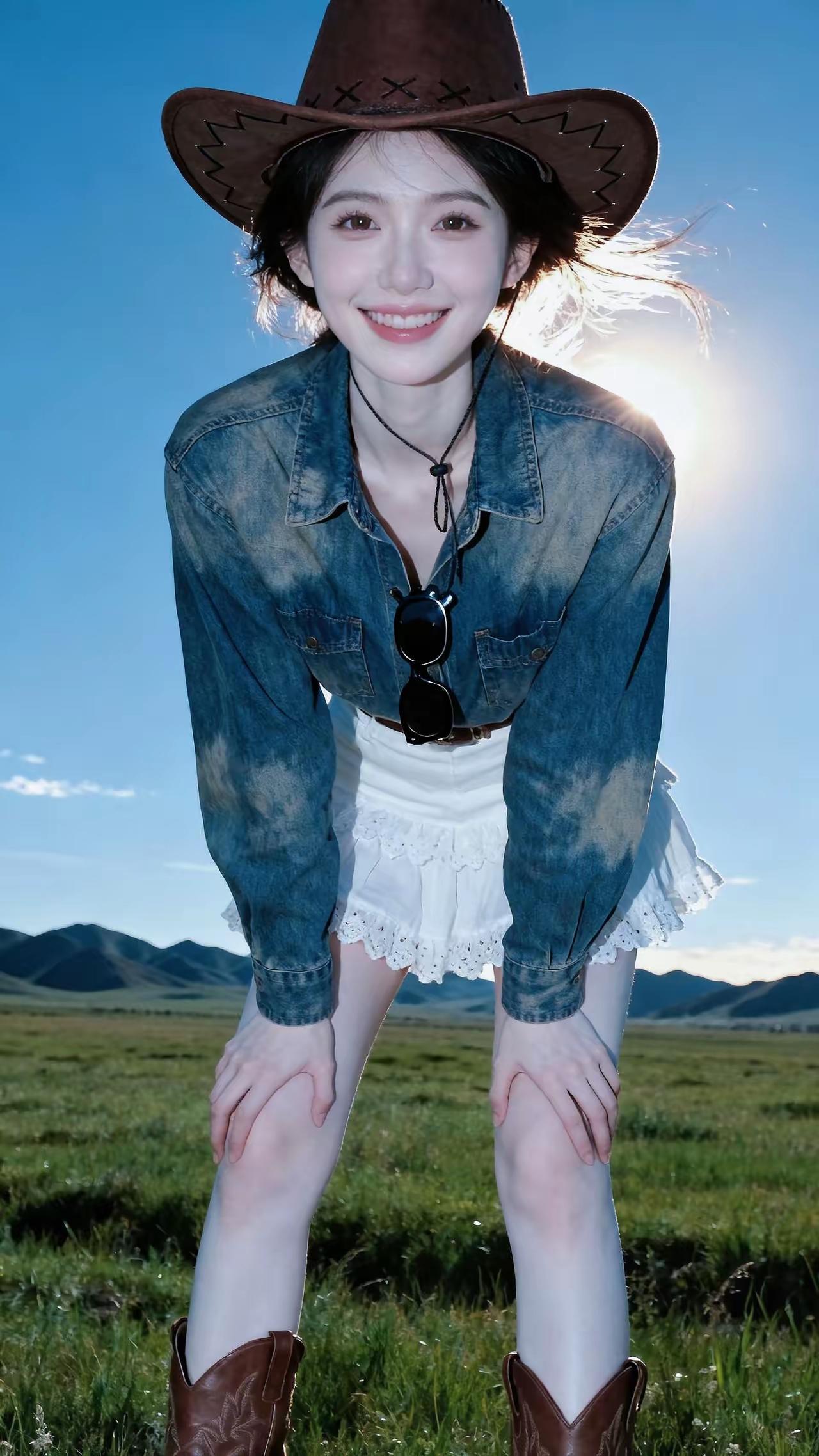 牛仔少女在草原上吹吻,自由自在,阳光灿烂!🌞👒👗👠