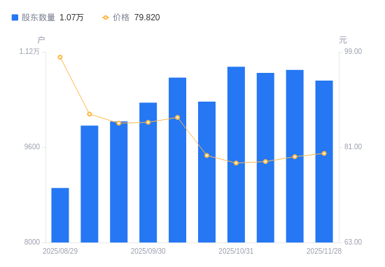 日期A股户数(户)流通A股户均持股数(股)户均持股市值(万元)2025-11-28107183189.3325.462025-11-20108963137.2224.852025-11-10108483151.1124.672025-10-31109513121.4724.352025-10-20103643298.2626.202025-10-10107673174.8127.502025-09-30103483303.3628.312025-09-19100313407.7629.152025-09-1099623431.3629.942025-08-2989153834.3537.58