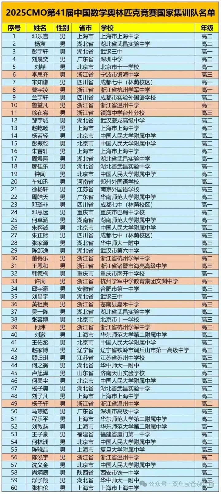 前天,2025年全国中学生数学奥林匹克竞赛(决赛)闭幕,数学国家集训队名单公布。名单共60人,他们是这届国内中学生数学竞赛最顶尖的选手,均已获得清北保送资格。