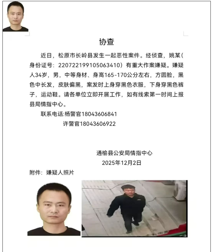 12月2日,网传吉林省松原市发生一起恶性案件。网传一份协查文书:近日,松原市长岭县发生一起恶性案件。经侦查,姚某(身份证号:220722199105063410)有重大作案嫌疑。嫌疑人34岁,男,中等身材、身高165-170公分左右,方圆脸,黑色中长发,皮肤偏黑,案发时上身穿黑色衣服,下身穿黑色裤子,运动鞋。请各单位立即开展工作,如有线索第一时间上报县局情指中心。下附通榆县公安局警官的联系方式和嫌疑人照片。