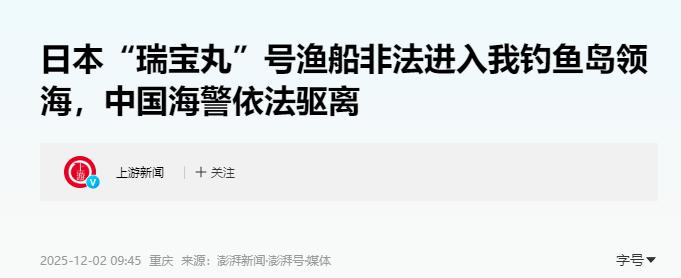 日媒称“中国在钓鱼岛的舰炮已就位”,关键时刻,台当局送大陆一句话。 12月2日当天,日本的“瑞宝丸”号渔船闯入了我国钓鱼岛领海,中国海警马上行动,对其进行了驱离。令人没想到的是,日媒随后就公布了两个消息: 1.日媒称:当时日本海上保安厅的船也在附近,但中国海警完全没有给日方任何面子,直接靠近了中方渔船。 2.日媒称:当时在不远处还有另外两艘中国海警船,而且从画面上看,中方船上舰炮已经就位。也就是说,如果日方船只不走,那中国海警完全有直接开火的可能。   日本“瑞宝丸”号渔船闯我国钓鱼岛领海,被中国海警当场驱离后,日媒立马跳出来搞事情,抛出“中国海警舰炮就位”“不给日方面子”这类说法。   看似在炒紧张氛围,实则把日本在钓鱼岛问题上的没理还嘴硬暴露得明明白白。而关键时刻台当局凑上来送的那句话,更把这事儿背后的博弈门道给凸显出来了。   这“瑞宝丸”号根本不是啥偶然闯入的普通渔船,而是个多次挑衅的惯犯。查一查它的黑历史就知道,之前就反复非法闯钓鱼岛及周边海域。   每次都被中国海警依法怼回去。这次明知道会被驱离还来,摆明了就是带着试探甚至挑事的心思来的。   日本敢让这么一艘渔船反复蹦跶,背后肯定是海上保安厅在撑腰,日媒也特意提了一嘴当时有海保船在附近,想营造“我方有人罩着”的假象。   但他们显然低估了中国海警护主权的决心和硬实力,中国海警直接靠上去驱离,本来就是对非法入侵者的正常操作,日媒喊的“不给面子”,说白了就是自己理亏,还对中国行使主权瞎抱怨。     再说日媒重点炒作的“舰炮就位”,这事儿说穿了就是中国海警船正常执法的必要准备,也是给非法入侵者的明确警告信号。   懂行的都清楚,这次执行驱离任务的,大概率是咱们海警的先进大型执法舰,这款船被网友戏称为“海警版护卫舰”,装备拉满,在全球同类执法船里都是顶尖水平,对付“瑞宝丸”这种渔船,还有日本海保的常规巡视船,那真是拿捏得死死的。   日媒特意把“舰炮就位”拿出来大做文章,无非就是想把中国的合法维权,硬生生抹黑成“武力威慑”。   但稍微有点常识的人都懂,执法的时候让武器装备保持戒备状态,是国际上的常规操作,目的就是应对可能出现的突发情况。   中国海警一向是“先警告、后处置”,舰炮就位不代表要主动开火,而是明明白白告诉日方:“别越界,再瞎闹后果自负”。   反观日本海保那些所谓的“支援船”,就算是他们最拿得出手的型号,火力配置也只是小口径舰炮加高压水炮,跟咱们的执法舰比差远了。日媒之所以这么大肆渲染,说白了就是实际实力跟不上,只能靠舆论造势来找补。   再往根儿上扒,钓鱼岛及其附属岛屿本来就是中国的固有领土,这事儿有铁打的历史和法理证据。   像《开罗宣言》《波茨坦公告》这些战后国际文件,都明明白白规定了日本的主权范围就限于那几个主要岛屿,钓鱼岛压根不在里面。   日本战后还盯着钓鱼岛不放、反复挑衅,本身就是在戳战后国际秩序的脊梁骨。从现实利益来看,钓鱼岛周边海域不只是我国渔民祖祖辈辈打鱼的地方,战略价值更是重中之重。   按照相关国际公约,一个有划界意义的岛屿,能划出不小的领海和广阔的专属经济区,这也是日本为啥死咬着钓鱼岛不放的关键原因。   这几年,日本在西南方向一个劲儿加码军事部署,频繁派海保船在钓鱼岛海域晃悠,甚至还想搞个所谓的“钓鱼岛警备法”,允许动武强制驱离,这些操作都在不断拉高中日在钓鱼岛海域发生意外的风险。   中国海警加强在这片海域的维权执法,让装备保持戒备状态,说白了就是对日本这些危险操作的必要回应。