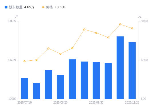 日期A股户数(户)流通A股户均持股数(股)户均持股市值(万元)2025-11-284646313046.0624.172025-11-105020912072.7223.362025-10-103325417317.0528.852025-09-303378717043.8730.002025-09-193403016922.1730.972025-08-293550016221.4523.442025-08-202550122581.9130.062025-07-312857620151.9229.002025-07-182041928202.2333.982025-07-102361724383.3428.67
