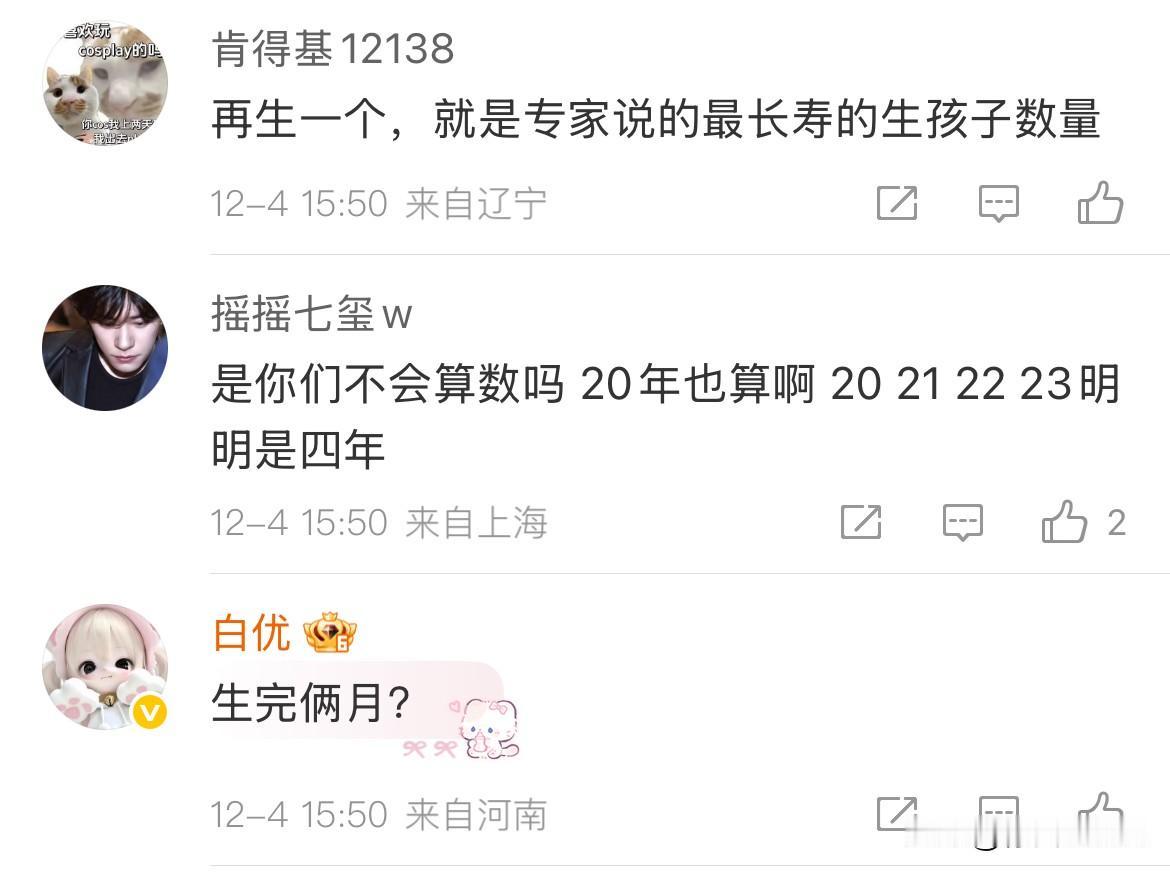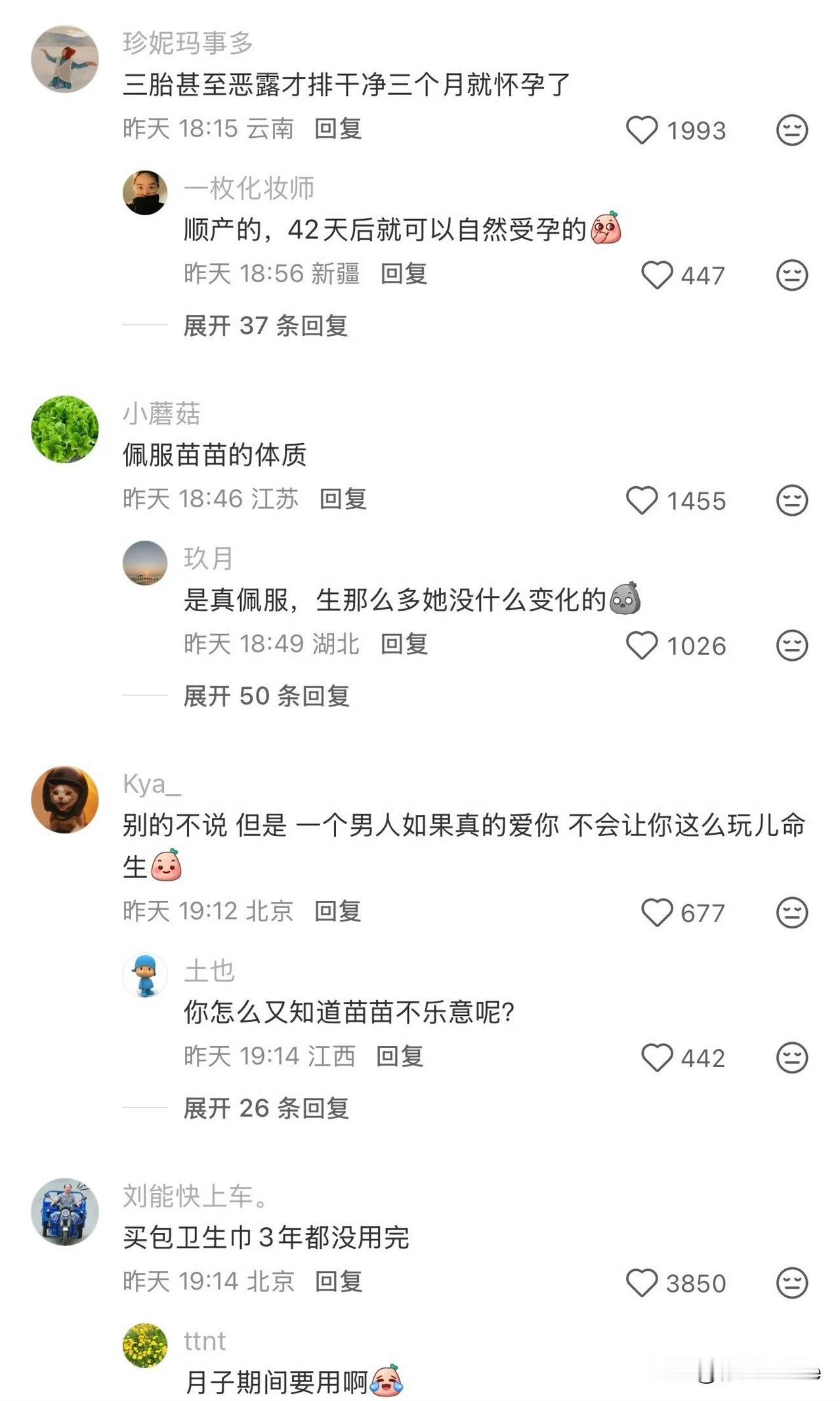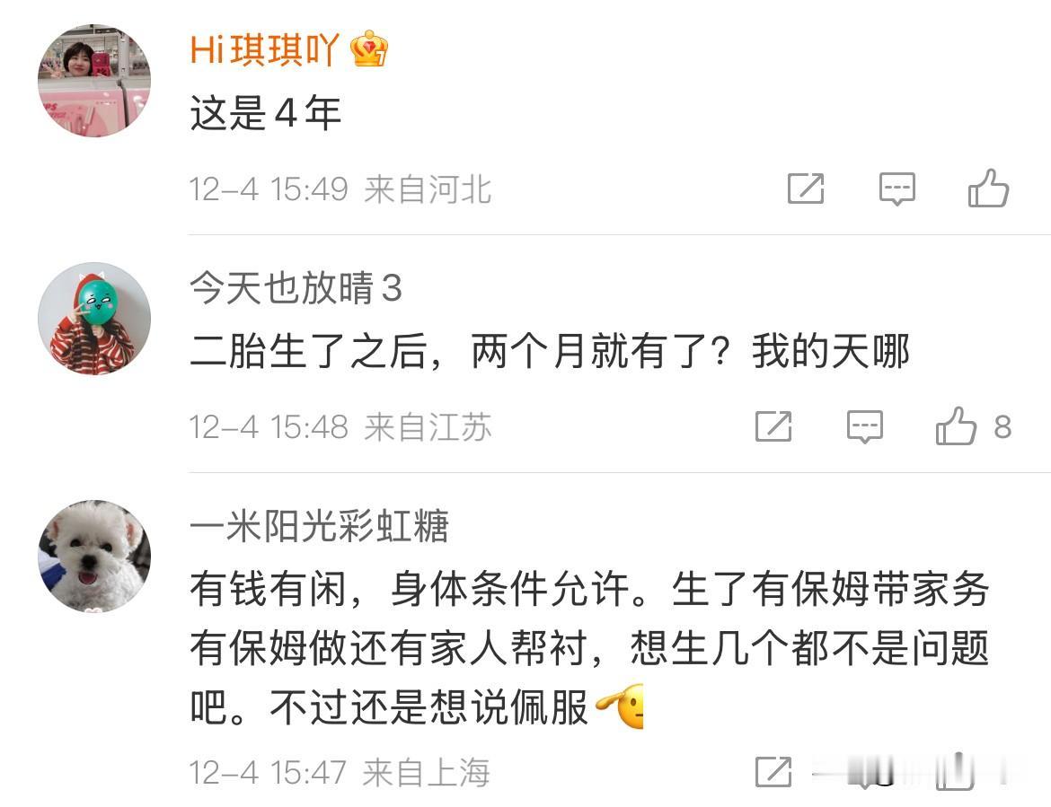 12月4日,郑恺苗苗,三年生3个孩子! 网友质疑郑恺不爱苗苗,不顾苗苗身体,给我看笑了,有没有人注意生产时间线啊! 现在这个节奏看上去可能感觉很频繁,实际上如果是顺完全没问题,在5060年代,基本每家每户都是这样的节奏,谈不上郑恺不爱苗苗,只能说他们正常夫妻,有了就要! 苗苗年轻,身体恢复的好,愿意生,有条件生,祝福就好了,没必要给她扣玩命帽子…… 郑恺