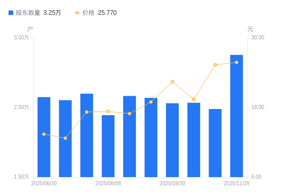 日期A股户数(户)流通A股户均持股数(股)户均持股市值(万元)2025-11-283254613774.4835.502025-11-102477918092.1045.852025-10-202568417454.6133.882025-09-302560317509.8339.292025-09-192638517065.1332.342025-09-102666216887.8428.612025-08-082389718841.8432.622025-07-312698916683.2228.732025-07-102605117283.9221.972025-06-302648417001.3422.78