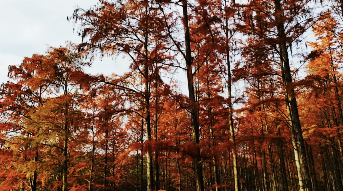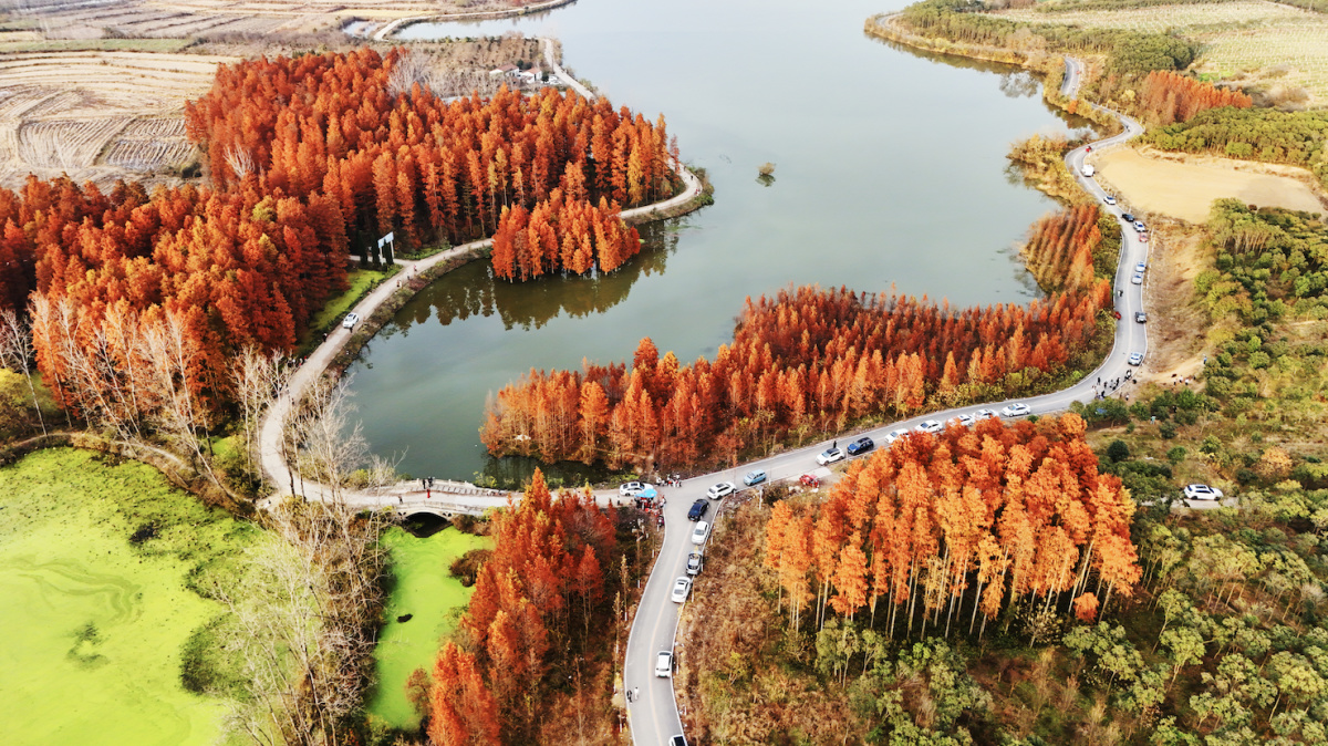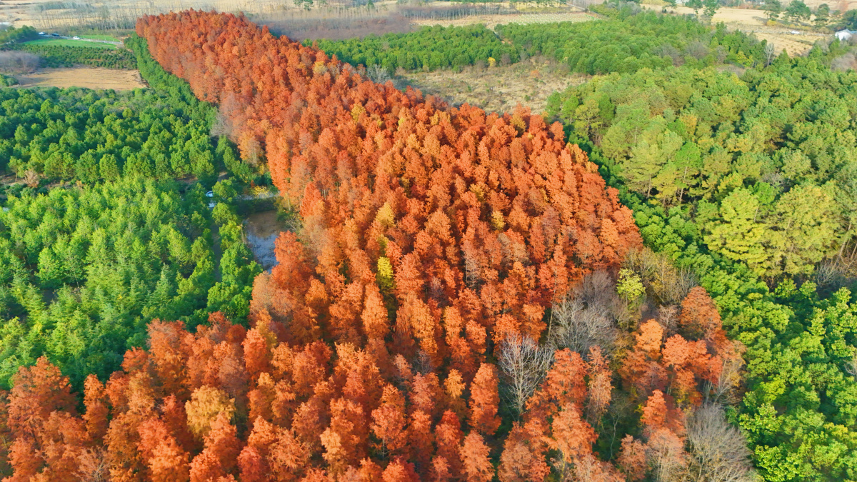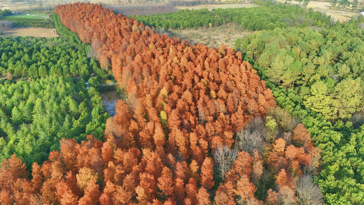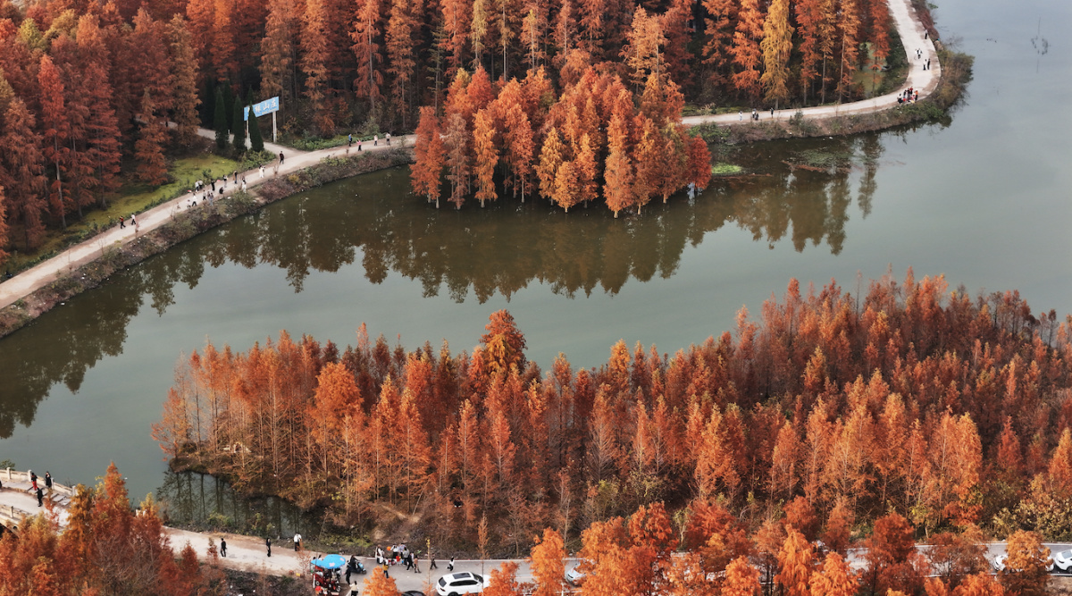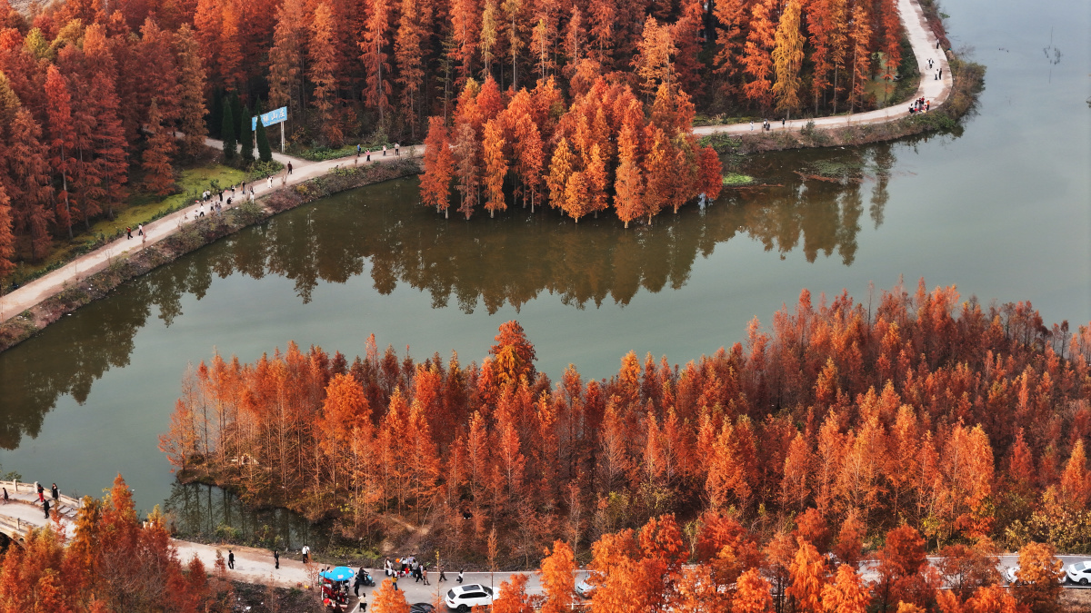 12月2日,河南省信阳市固始县胡族铺镇杨店林区的水杉经霜露点染,褪去夏日葱茏,换上丹红新装,阳光穿过枝叶洒落斑驳光影,为寒冬增添几分暖意与诗意,游人漫步林间,或驻足欣赏,或嬉戏玩闹,欢声笑语在林区回荡。