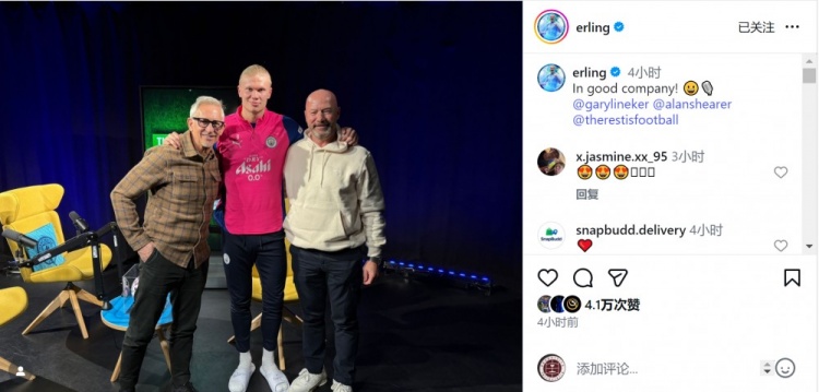 哈兰德参加莱因克尔、希勒的节目,他在社交媒体上晒出三人合照,配文:“与良伴同行!”