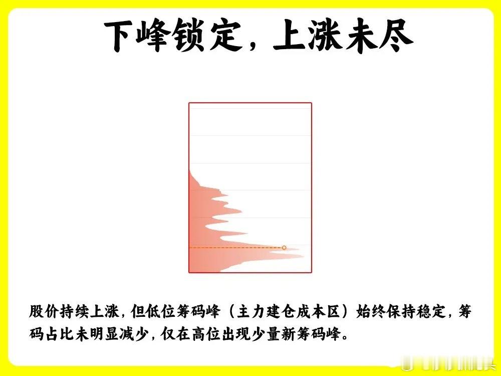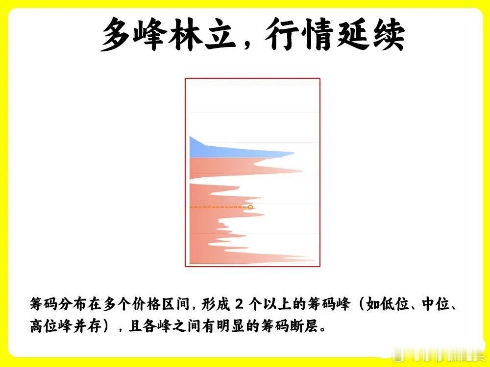 新手看价,老手看量,高手看筹码峰。但是真正了解筹码峰的却少之又少。今天莎莎把市场最为经典六种筹码峰形态分享出来,可以让大家对筹码峰的认知能大大提升。一、上峰不移,下跌不止股价出现长时间的下跌,筹码分布在高位出现筹码密集区,随着股价的下跌,上方的筹码并没有出现明显的松动,也就是我们常说的套牢盘,这就是上峰不移。说明此时的市场,抛压还并没有释放完毕,那往往后市还会继续阴跌,进入下跌趋势当中。二、单峰密集,主力参与股价在低位横盘的阶段,筹码分布图里,出现筹码密集区,形态很明显的,密集程度高于其他阶段的一个筹码峰,这就是单峰密集,说明此时股价在低位的时候,主力开始逐步建仓,筹码峰越长,说明这个价格区间筹码堆积越严重三、多峰林立,行情延续在上涨趋势当中,筹码分布图里,出现多个筹码筹码峰,每一个筹码密集区,都出现断层,说明股价在上涨趋势的时候经过了拉升、洗盘、拉升等动作,这个一个最为健康筹码分布形态,说明上涨趋势比较稳定,尤其最下方的筹码密集区,筹码并没有出现松动情况下四、筹码上移,需要谨慎股价的低位阶段,筹码分布图中,形成了低位单峰密集成交区,随着股价继续上涨,下方的筹码密集区,开始松动,筹码开始逐步向上移动,说明下方筹码开始离场,在高位出现新的密集成交区五、下峰锁定,上涨未尽上涨趋势里,股价一路上涨,最下方的主力建仓位置,出现筹码峰,一直处于锁仓状态。说明此时的获利盘并没有开始出货,主力高度控盘下,说明此时股价还处于一个上涨趋势里六、双峰填谷,上下震荡股价在一个箱体里或是低震荡过程里,在筹码分布里,出现两个筹码密集成交区,两个山峰之间,筹码很少,我们叫他峰谷。最上方的筹码峰是套牢盘,最下方的筹码峰是低位获利盘。等什么时候市场开始选择新的方向,筹码峰变成一个的时候,说明横盘震荡要结束了兄弟们点赞评论就是最莎莎最大的支持
