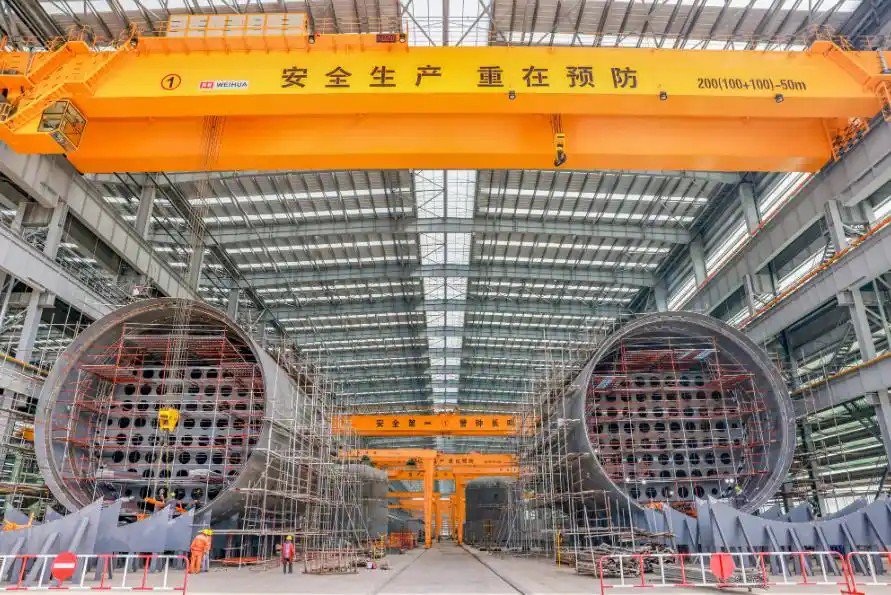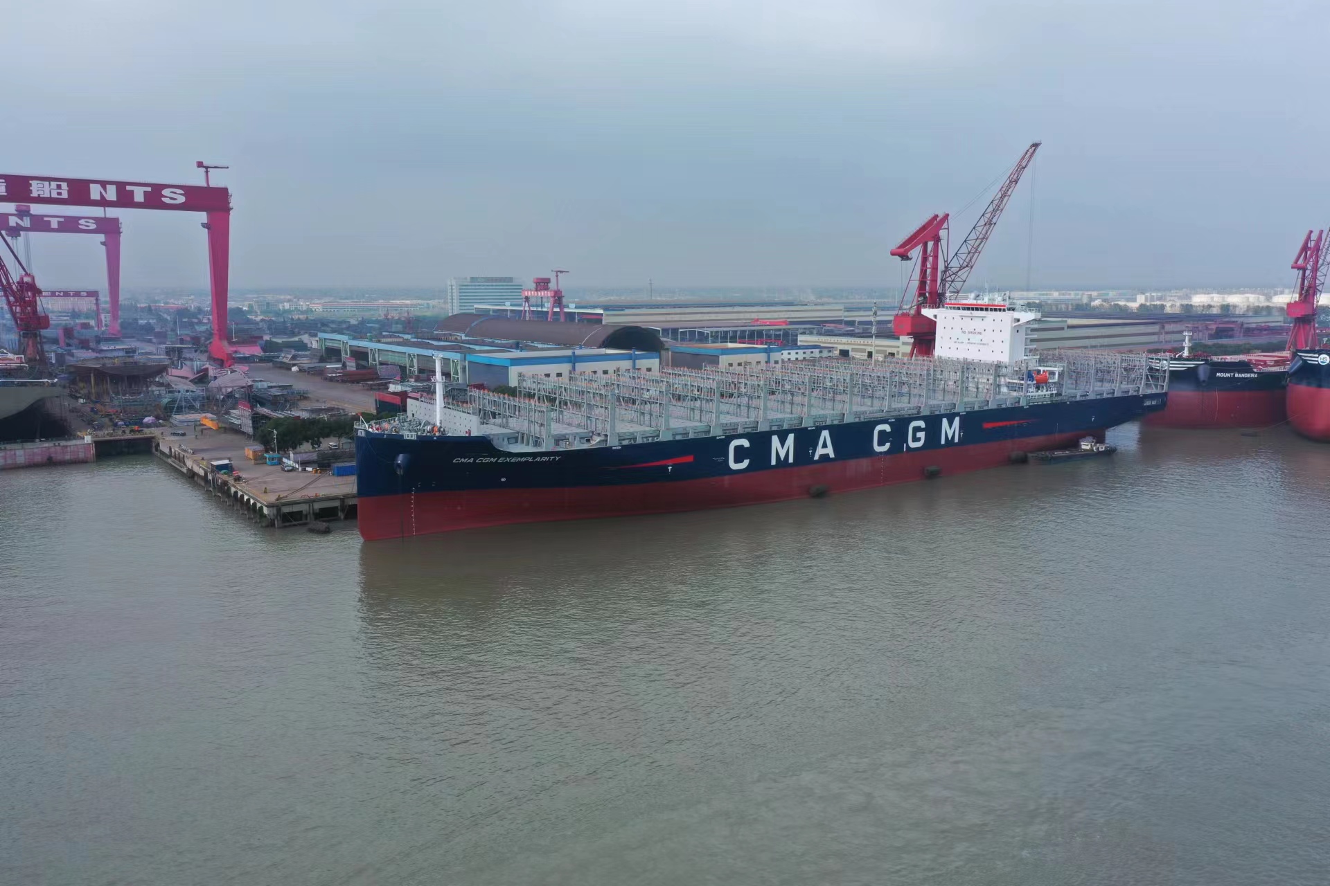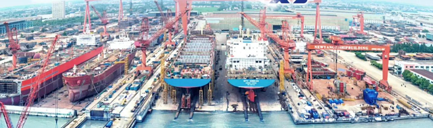 新时代造船交付的国内首艘甲醇双燃料9000TEU集装箱船,标志着泰州市在清洁能源船型领域实现突破;扬子鑫福为法国达飞海运集团承建的首制24000TEU双燃料动力集装箱船,是全球最先进的绿色船舶之一,与传统燃油集装箱船相比,二氧化碳排放量减少约20%,硫氧化物和颗粒物排放量减少99%。新时代造船建成国内最大单体智能化分段车间(480米长),提升平面分段效率30%,将巴拿马型散货船建造周期从2年缩短至8个月。泰州船企还全面推广“数字化船厂+智能化船舶”的生产模式,以智能化转型抢占未来赛道。新扬子造船的“资源动态配置”场景入选国家级智能制造优秀场景。集群发展与龙头引领的协同发力在泰州近百公里江岸上,大型龙门吊一字排开。巍峨的龙门吊是长江的守望者,也是泰州造船业崛起的见证者。