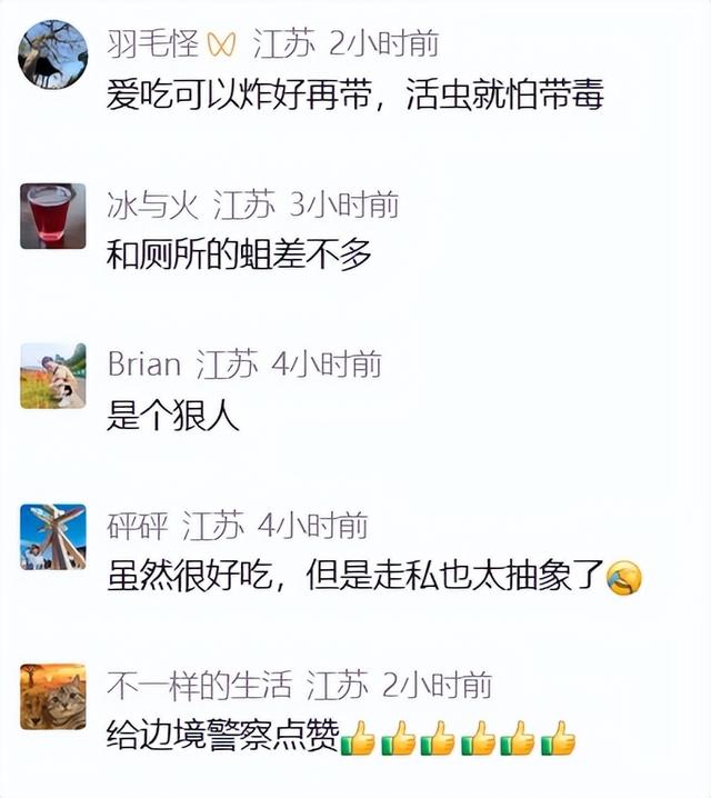 据了解,这种竹虫在西双版纳当地市场很受欢迎,被视为独具地方特色的一道美味。而竹虫的境内外价差近一倍,一些人受利益驱动,试图通过人身夹藏、行李物品藏匿等方式逃避海关监管、走私入境。