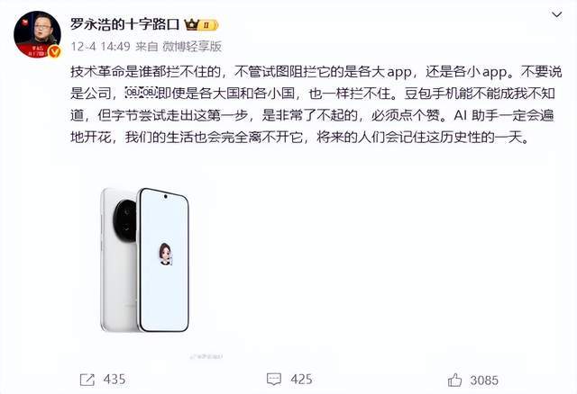 他在微博上直言:技术革命是谁都拦不住的,不管试图阻拦它的是各大app,还是各小app。……豆包手机能不能成我不知道,但字节尝试走出这一步,是非常了不起的……AI助手一定会遍地开花,我们的生活也会完全离不开它,将来的人们会记住这历史性的一天。