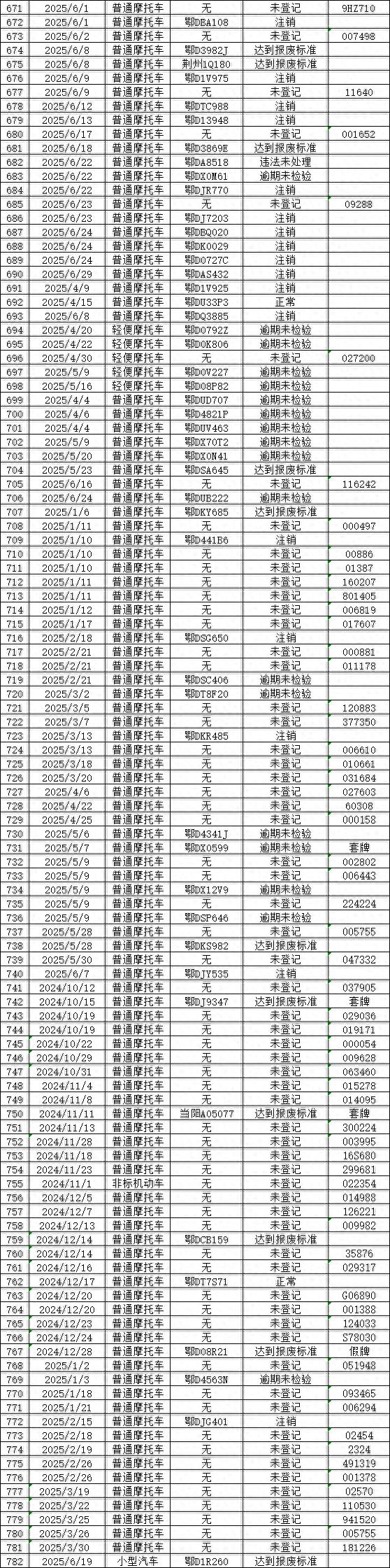 依据《中华人民共和国道路交通安全法》第一百一十二条之规定,请下列车辆的所有人、管理人或驾驶人(以下简称“当事人”),自本公告发布之日起三个月内,持公安交通管理行政强制措施凭证及相关有效证件,前往公安交通管理行政强制措施凭证载明的交警大队接受处理。当事人逾期仍未前来接受处理的,交警大队将根据《中华人民共和国道路交通安全法实施条例》第一百零七条的规定,对相关扣留车辆依法进行处置。
