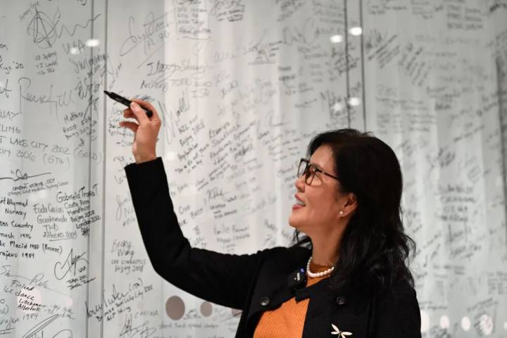 11月24日,郎平颁奖仪式后在签名墙上签名。