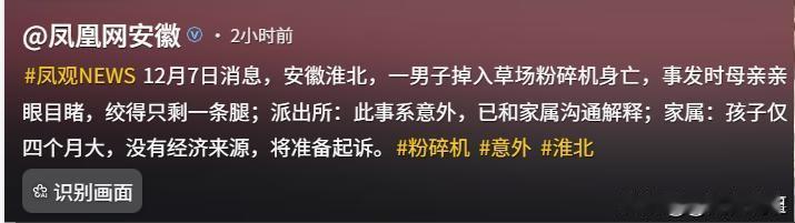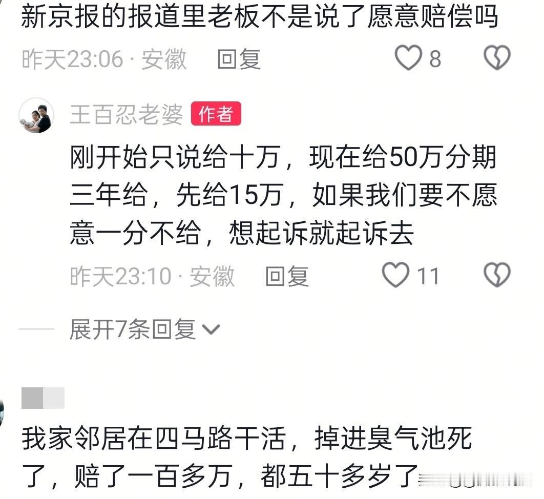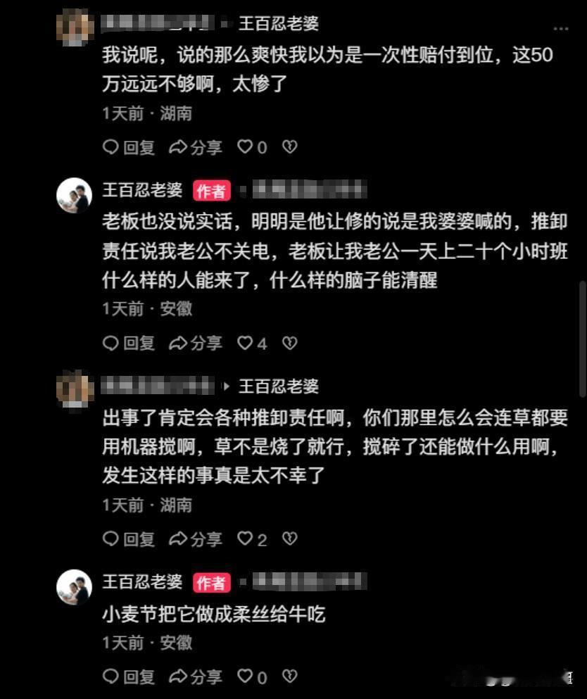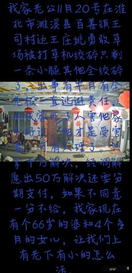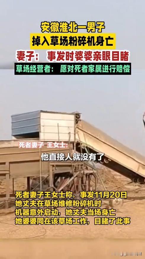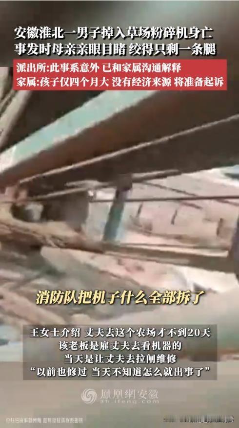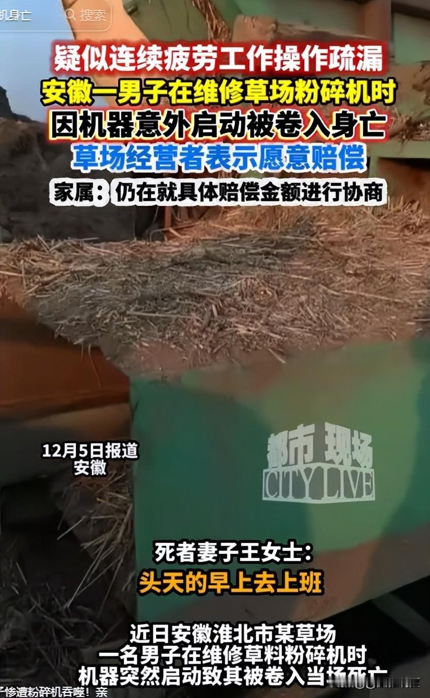 在安徽淮北,某草场,维修粉碎机意外去世的男人叫王百忍,今年37岁,老婆38岁,才结婚一年多,女儿6个多月,父亲早些年没了,妈妈为了减轻负担,也同样在草场工作。[嘘] 安徽淮北某草场近日发生一起安全事故,一名男子在维修粉碎机时坠落其中,经确认已不幸身亡。 据了解遇难者王百忍今年37岁,其家人表示,他到该草场工作不足二十天,草场经营者姚勇(化名)称,事发时设备出现故障,王百忍在未关闭总电源的情况下进行维修,身上携带的设备遥控器可能被误触,导致机器启动。 王百忍的妻子提供了不同的说法,她表示丈夫事发前一日工作至凌晨,仅休息约三小时后,又被叫回草场工作,她认为,长时间工作可能与此有关,此外她提到姚勇并未为王百忍缴纳社会保险。 事故发生后,双方就赔偿事宜进行协商,姚勇最初提出赔偿10万元,后经协商将金额提高至50万元,但要求分三年支付,家属对此支付方式存在顾虑,目前尚未达成一致,王百忍的妻子已聘请律师,计划通过法律途径解决。 这起发生在安徽淮北的悲剧,让很多人心里沉甸甸的,随着事件的后续发展,网友们一边是同情,一边是愤怒,讨论得停不下来。 “这家人以后可怎么办啊?媳妇刚结婚没多久就守寡,带着吃奶的孩子,还得顾着年迈的婆婆,这以后的日子,看着就让人揪心。” “什么叫带电作业?维修机器不断电,这首先不就是老板管理失职、安全意识缺失吗?出了事就说员工自己操作不当,这逻辑站不住脚。” “一天干将近20小时,人都是懵的,不出事是侥幸,出事是早晚的,这不就是把工人当机器用吗?” “老板说是因为他误碰了遥控器,可人累成那样,手抖一下、恍惚一下,太正常了,根子不在他碰没碰,而在为什么让他累到那个地步还要去高危作业。” 这 “人没了,家里天塌了,赔50万本身就不多,还要分期三年?这是做生意还是赔偿?万一后面经营不好赖账了,这孤儿寡母找谁去?” “遗体还没下葬”,这个细节更是戳痛了很多人,赔偿谈不拢,人就不能入土为安,这对家属是持续的精神折磨。” “这事老板的责任跑不了,没签合同、没交社保、让员工超长时间疲劳工作、在高危环境下作业缺乏基本防护和监管,这几条加起来,不仅民事赔偿上占主要甚至全部责任,如果调查证实设备本身有重大安全隐患,还可能涉及刑事责任。” “不是赔钱就能了事的,必须查清楚,该负什么责就负什么责。” 对于这起事件,你认为事故的主要责任在谁?是违规操作的员工,还是疏于管理的老板?分期支付赔偿款的方式,你能接受吗?如果你是这位妻子,接下来会怎么做? 信息来源:凤凰网安徽