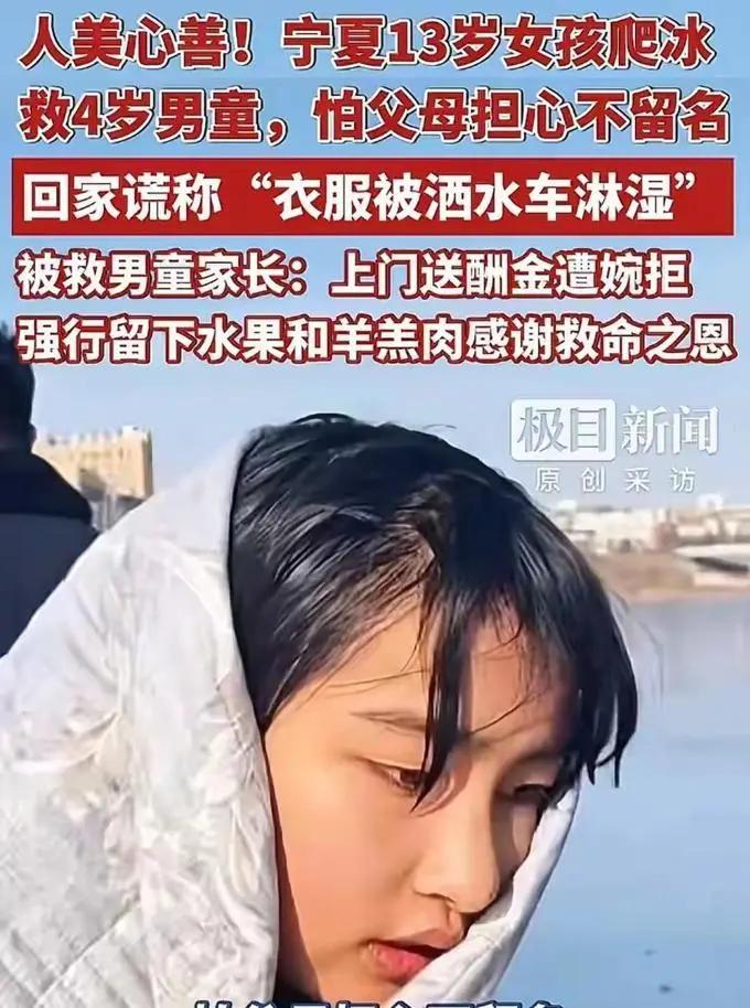 “佳婷,你这衣服咋湿了?” “刚才不小心让洒水车洒湿了。” 面对父亲李晓辉的询问,14岁的李佳婷一脸平静地回答。然而,她的父亲并不知道,自己的女儿刚刚完成了一件了不起的壮举。 时间回到12月6日,在宁夏回族自治区吴忠市同心县,4岁男童轩轩(化名)在结冰的豫海湖上玩耍时,冰层突然碎裂,他掉入了湖中。冰冷的湖水瞬间没过轩轩的胸口,他吓得放声大哭 。岸边几位围观的大人立即报警,但因担心冰面再次坍塌,不敢贸然上前营救。 “姨姨,我身体轻,我下去救!”危急时刻,骑车路过的李佳婷挺身而出。看着冰窟中不断挣扎的轩轩,李佳婷没有丝毫犹豫,接过大人们找来的管子,在冰面上一点点向冰窟走去。然而,就在紧要关头,冰面又发生塌陷,李佳婷不慎坠入湖中。冰冷的湖水瞬间浸透了她的校服,刺骨的寒意让她忍不住打起寒颤,但她死攥着管子没有松手 。岸边的大人们见状,立刻合力拉拽,将李佳婷拖上岸。 随后,消防员及时赶到,成功将落水男童营救上岸。看着轩轩被安全救出,浑身湿漉漉的李佳婷悄然骑车离开。直到当晚11点多,李佳婷的姑姑刷到侄女救人视频,打电话告知李晓辉,这位父亲才得知女儿的英勇举动。 李佳婷的善举迅速在网络上传播开来,网友们纷纷为她点赞: “小小年纪,却有如此大爱的精神,这才是新时代少年该有的样子!” “善良勇敢的孩子,她的行为让人感动,是我们学习的榜样!” “在危险面前,她没有退缩,这种见义勇为的精神值得赞扬!” 李佳婷在学校特别热心,同学闹矛盾她去劝和,做好事从不张扬。面对大家的称赞,14岁的李佳婷腼腆地说:“我身子轻,就想着赶紧把小弟弟救上来,其他的也没多想。” 在赞美李佳婷挺身而出的同时,我们也必须要强调:生命至上,安全为先!发现有人落水,不管会不会游泳,都不要盲目下水救人。面对危险,智慧与冷静同样重要 。李佳婷的事迹,也给所有孩子和家长上了生动的一课,见义勇为值得鼓励,但见义智为更应被倡导。落水男孩被救