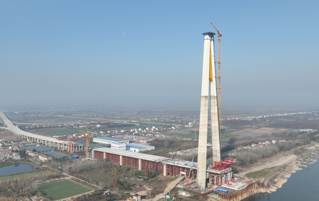 斜拉索作为斜拉桥的“生命线”,是桥梁的重要组成部分,起着连接主塔和主梁的纽带作用。作为武汉至松滋高速公路关键性控制工程,观音寺长江大桥主桥总长1860米,主跨达1160米,是目前世界最大跨径公路斜拉桥、世界最大跨径组合梁斜拉桥、世界最大跨径钢-UHPC组合梁斜拉桥、世界首座超千米组合结构斜拉桥。大桥采用“A”字形组合式桥塔结构,塔高262米相当于87层楼高,为湖北长江大桥最高塔,其5.58度最大倾角设计既保障结构刚度,也为斜拉索安装带来极高技术挑战。