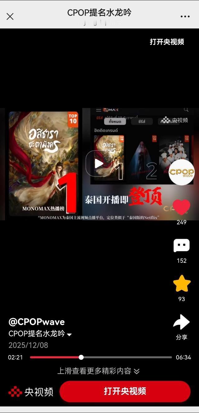 央视频提及CPOP推荐,给予《水龙吟》高度评价。称水龙吟是最近好多国家的观众都在repo的新剧,中国出海最强剧种武侠片的Z世代审美版——“玄幻武侠”在海外大火。随着罗云熙《水龙吟》海外23个平台播出,全球8600+城市同步收看“!《水龙吟》中华文化海外输出成效有目共睹。