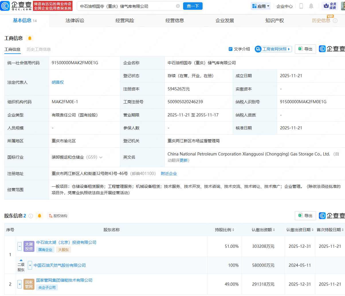 企查查APP显示,近日,中石油相国寺(重庆)储气库有限公司成立,法定代表人为胡昌权,注册资本为59.45亿元,经营范围包含:仓储设备租赁服务;工程管理服务;机械设备租赁等。企查查股权穿透显示,该公司由中国石油(601857)旗下中石油太湖(北京)投资有限公司、国家管网集团储能技术有限公司共同持股。