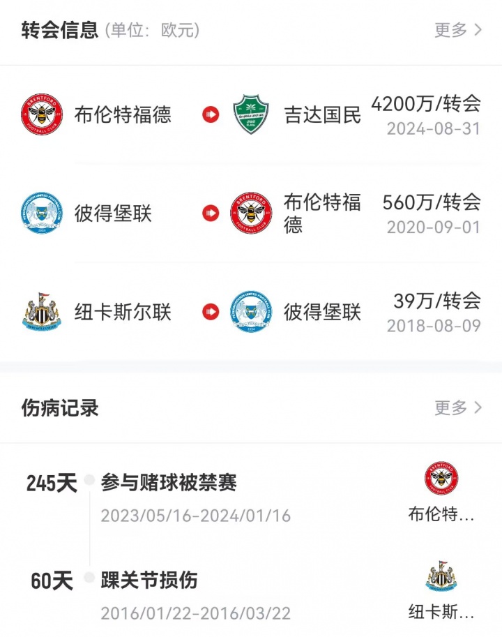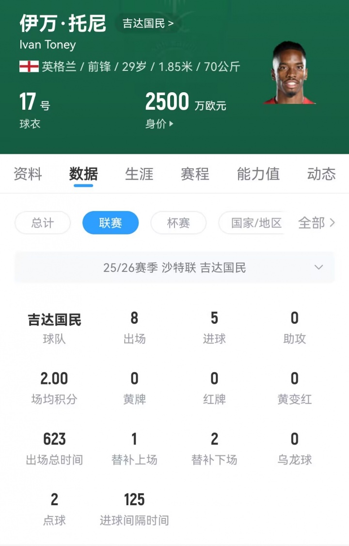 去年夏窗伊万·托尼从布伦特福德以4200万欧元价格转会至吉达国民,本赛季联赛出场8次贡献5球;此前他曾因参与赌球被处以长期禁赛。