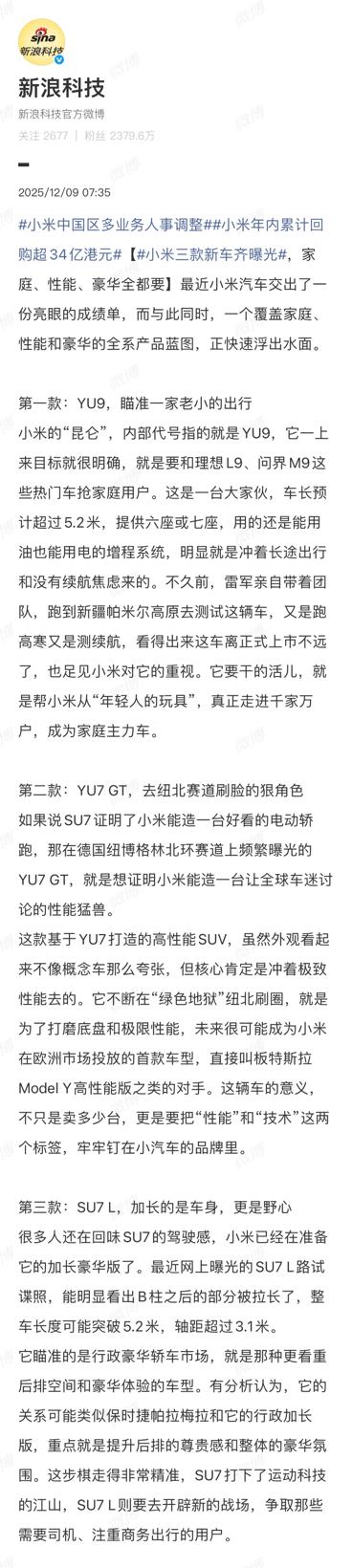 新浪科技爆料小米三款新车! - YU9:增程式家庭旗舰SUV,对标理想L9和问界M9,雷军带队在新疆帕米尔高原完成高寒及续航测试,预估价格40-50万; - YU7 GT:高性能SUV,对标Model Y高性能版,纽北要证明自己; - SU7 L:车长超5.2米,定位行政豪华,对标保时捷帕拉梅拉行政版、宝马5系/奔驰E级等行政轿车,后排豪华属性或进行大幅度提升。 想要复刻前两台车的成功,尤其是YU7的大定成绩应该很难了。【来自懂车帝车友圈】