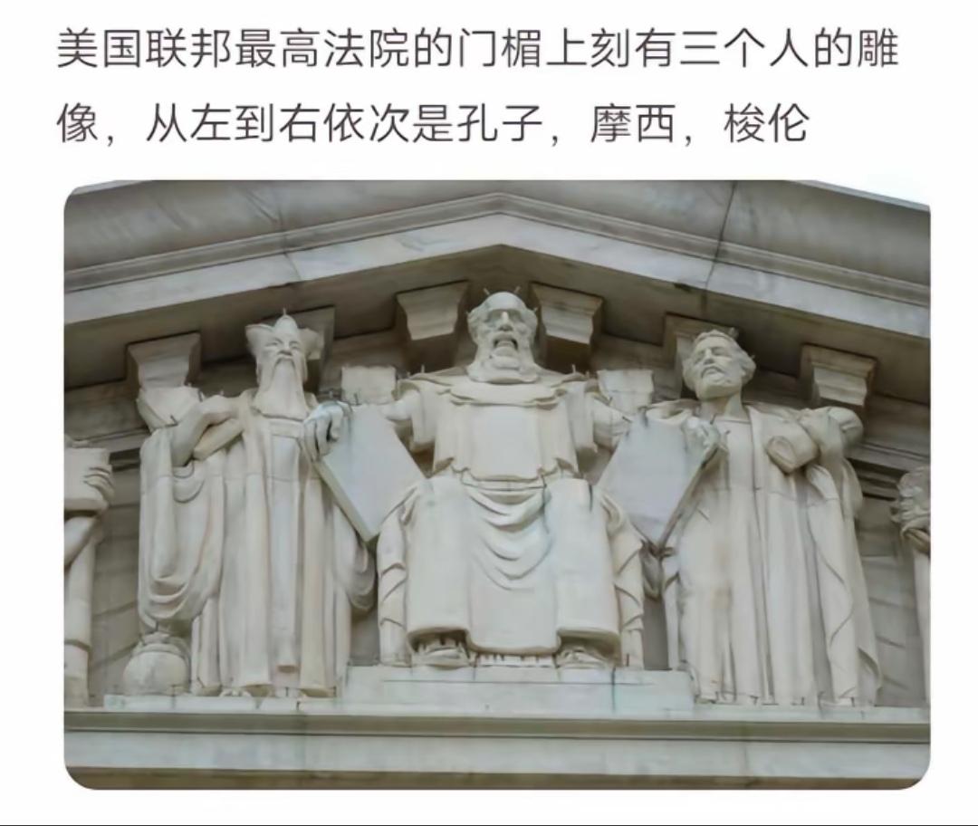 每次看到这样的事例,我会深刻明白和理解为什么当年孔子会用毕生的时间和心血周游列国,向帝王和百姓宣传他的德治和仁者爱人的思想。因为他所处的那个年代,就像今天的中东、南非和缅甸等地区一样动荡不安,礼仪和道德崩塌,人人为了自己的利益而不择手段,人人奉行丛林法则,人人活在担惊受怕的恐惧之中。 无论在哪个年代,和平都是建立在道德和法治的基础上的。道德是内核,法律是最后的底线,只有在这之上才有和平和自由的可能。这也是为什么朱熹说“天不生仲尼,万古如长夜。”虽然现代人对其封建迂腐的方面多加批判,甚至视其文化为糟粕,但不可否认的是那个时代的中国一定是需要这样一个人挺身而出的。 所以即使在提倡自由的西方,人们很可能没听说过秦皇汉武和唐宗宋祖,但大概率都知道孔子Confucius 的名字,并把他推举为“世界十大文化名人”之首,更难以想象的是,在美国联邦最高法院大楼的门楣上雕刻着三位代表人类文明基石的先贤,孔子就位列其中。 孔子 孔子的伟大贡献
