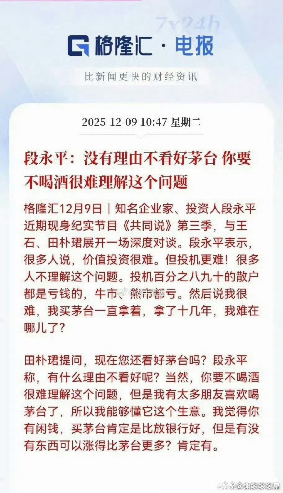 段永平谈看好茅台段永平谈价值投资:买茅台拿十几年不难,难的是懂生意,投机虽刺激但散户易亏~